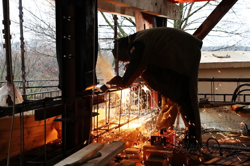 Сегодня доски будущей облицовки готовят: конструкции фрезеруются, проходят необходимую термообработку. Приступить к наружной обшивке деревянной стены могут уже через две недели. Пока же здесь идут работы по укреплению существующего фундамента. Сверху на него устанавливается бетонная балка – ростверк, еще одна бетонная конструкция появится по контуру существующего фундамента сбоку.