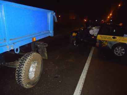 Водитель автомобиля такси ехал по улице Калиновского в направлении Серафимовича. Когда поравнялся с трактором, машину резко повело на полосу встречного движения, сообщает ГАИ УВД Гродненского облисполкома.