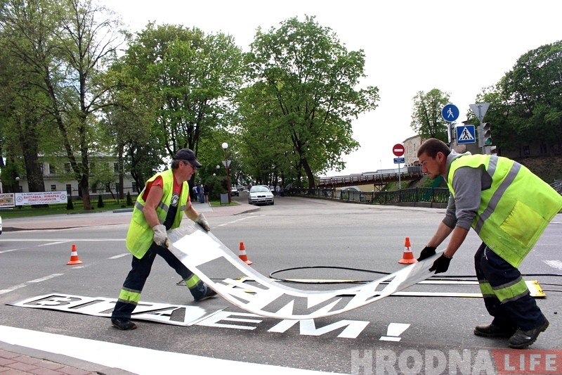 Первая надпись «Вітаем» появился на пешеходном переходе в районе автовокзала в конце апреля. К 9 мая в центре Гродно появится еще 5 таких надписей. Такое нововведение служб пришлось по душе как гродненцом, там и гостям города.