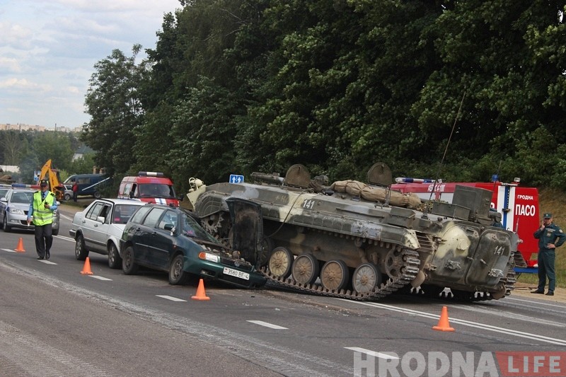 Известно, что колонна военной техники двигалась со стороны «Привала» и поворачивала в сторону Гродно. Выехав на главную, одна из БМП оказалась в заносе и выехала на встречную полосу, прямо на легковой автомобиль. Как сообщают свидетели autogrodno.by водителю автомобиля очень повезло. Его сиденье сложилось и он оказался в лежачем положении. Но рулем и панелью ему придавило ноги. Мужчину смогли спешно деблокировать.