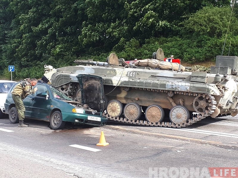 На выезде из Гродно в сторону Сапоцкино около 16:20 произошло столкновение боевой машины пехоты и автомобиля Volkswagen. По счастливой случайности обошлось без жертв.