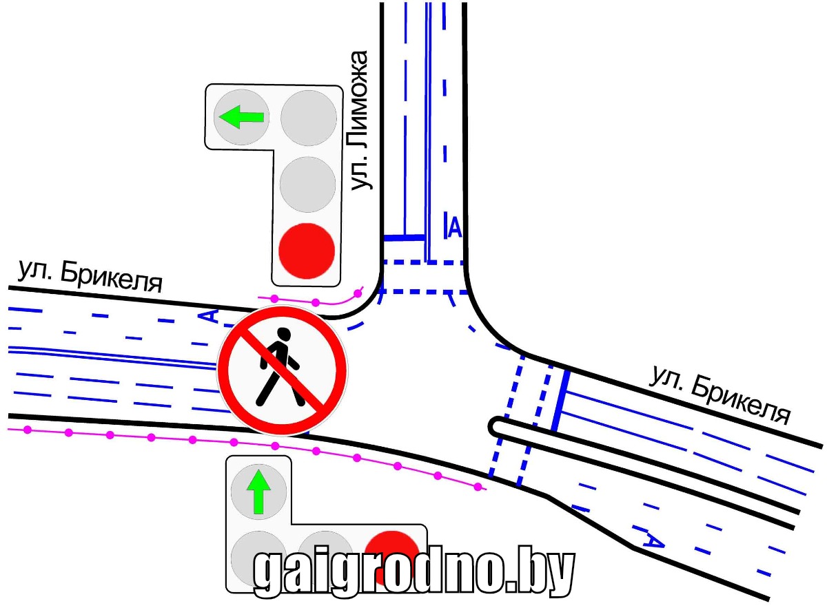 В ближайшее время будет изменена организация дорожного движения на перекрестке улиц Брикеля и Лиможа в Гродно. За 5 лет здесь в авариях пострадали 7 человек, 6 из них — пешеходы. На это участке уберут один пешеходный переход, а также изменят порядок движения по полосам и установят дополнительные ограждения и светофоры, сообщает ГАИ.