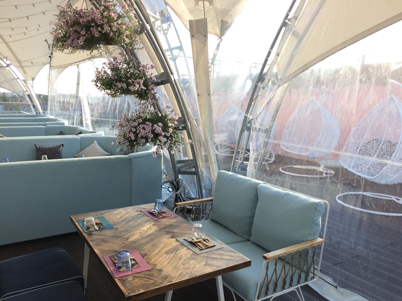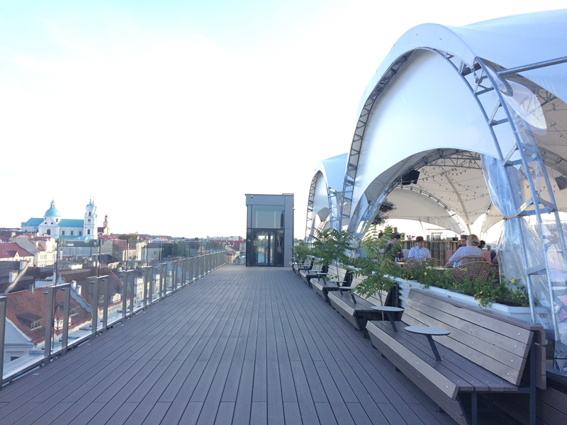 Территория смотровой площадки разделена на зону отдыха и территорию для прогулок. В центре обзорной площадки расположилось новое лаунж-кафе на 100 мест под названием «Крыша мира». Оно располагается на возвышенной террасе под навесом-куполом, занимает площадь 350 квадратных метров. Подобное кафе на крыше есть только в Минске, среди областных центров Гродно – единственный может похвастаться таким заведением.