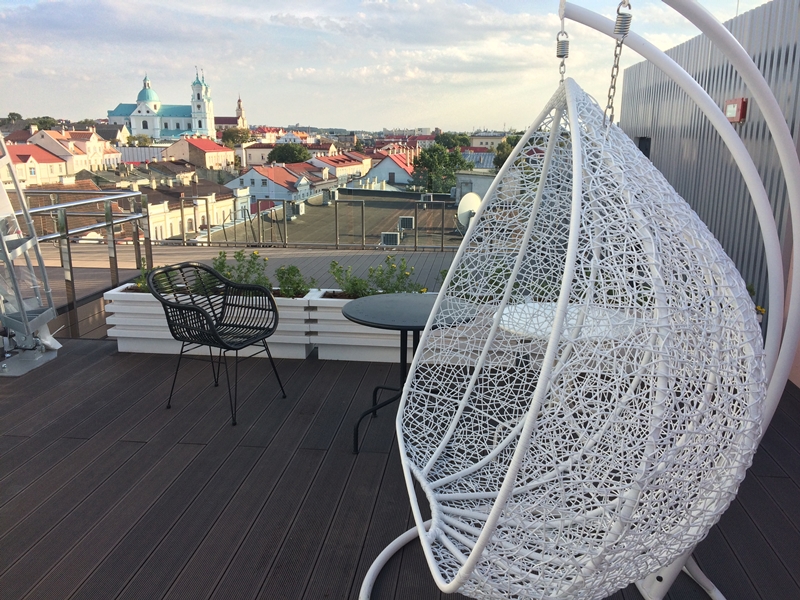 Смотровую площадку над бывшим универмагом символично назвали «Крыши старого города». Отсюда, как на ладони, видны крыши старых гродненских зданий, которые можно увидеть не через оконное стекло и не через прозрачные стенки обзорного лифта, а вживую.