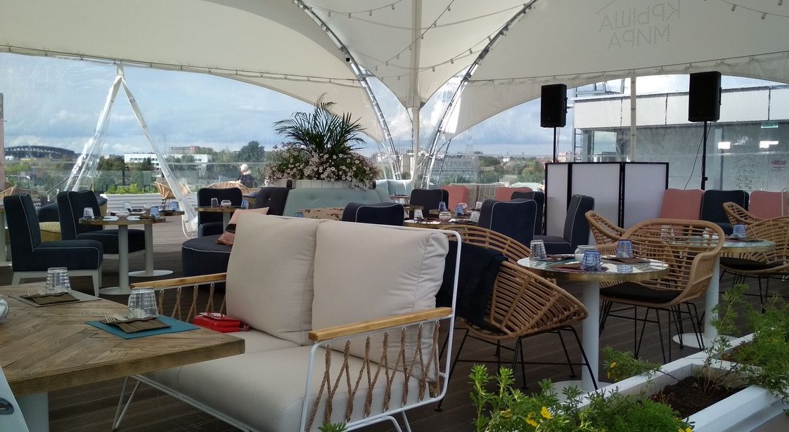 Территория смотровой площадки разделена на зону отдыха и территорию для прогулок. В центре обзорной площадки расположилось новое лаунж-кафе на 100 мест под названием «Крыша мира». Оно располагается на возвышенной террасе под навесом-куполом, занимает площадь 350 квадратных метров. Подобное кафе на крыше есть только в Минске, среди областных центров Гродно — единственный может похвастаться таким заведением.