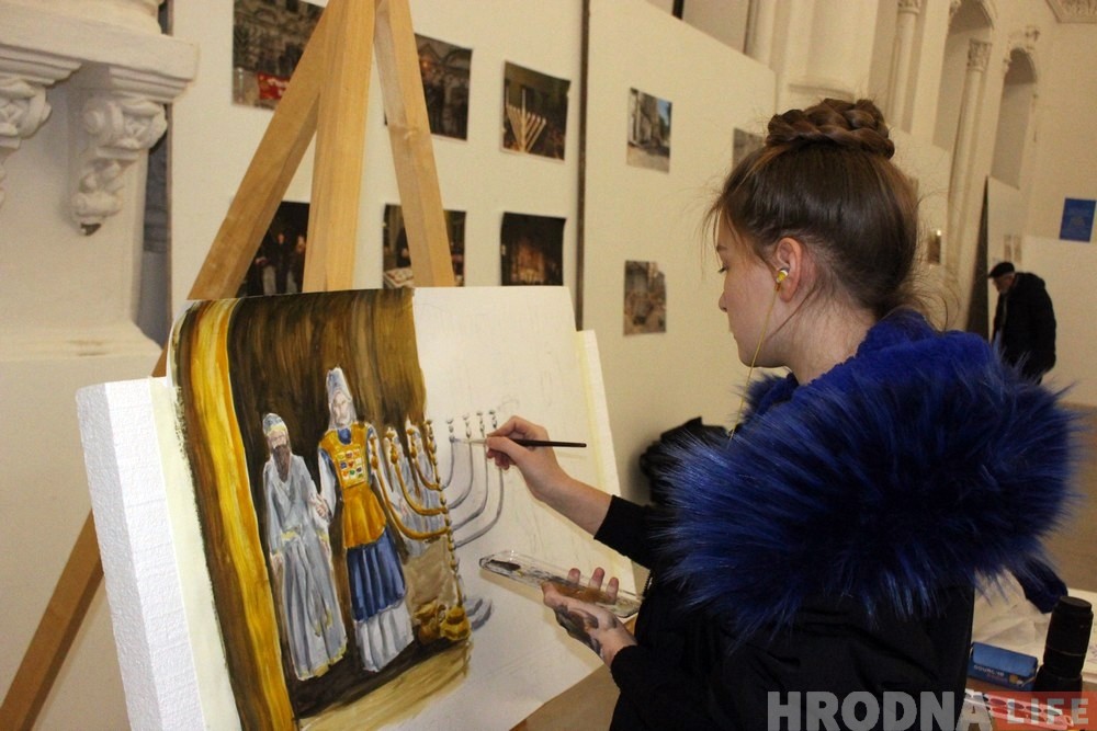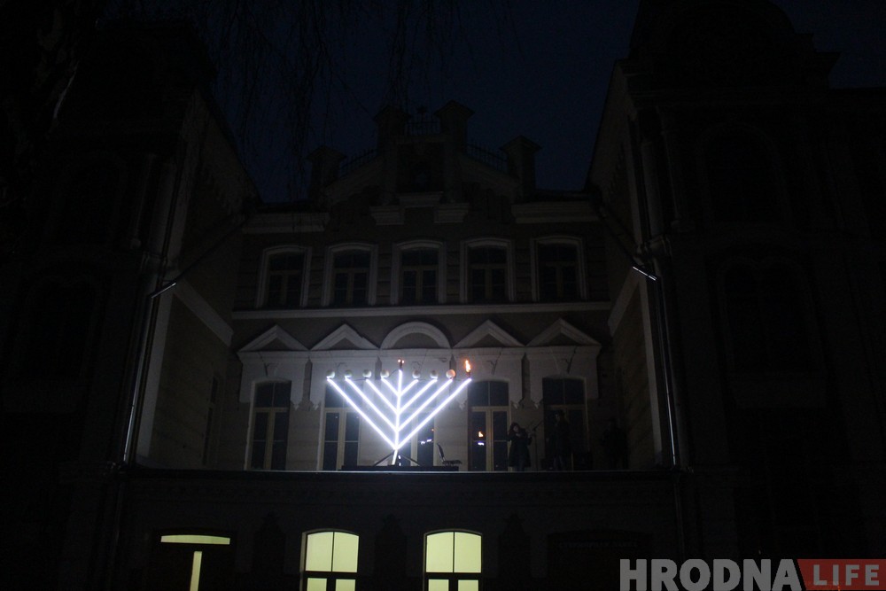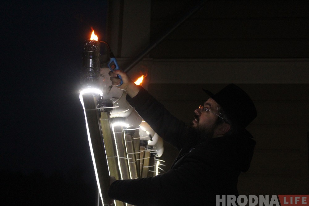 Основная традиция Хануки — церемония зажигания свечей. В Гродно она начинается с того, что раввин Ицхак Кофман и председатель общины Борис Квятковский зажигают первые две большие ханукальные свечи, которые установлены на фасаде синагоги. В этом году впервые вместе с зажиганием свечей прошел салют.