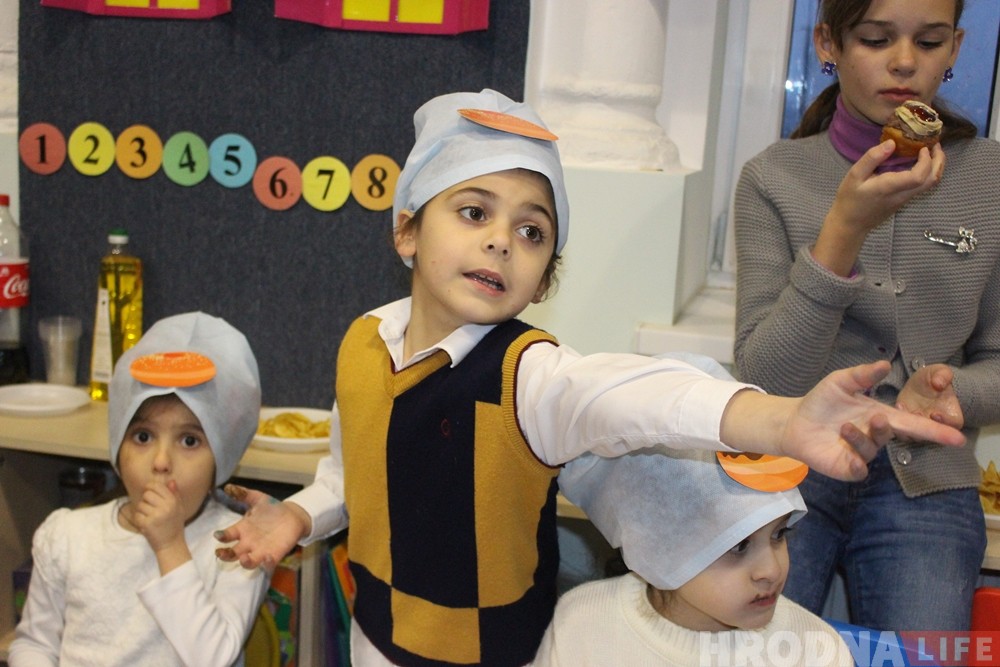 В синагоге маленьких гродненцев учили делать пончики, а также рассказали им историю праздника.