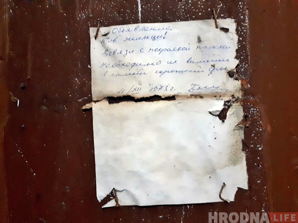 «Да, это объявление с тех временем, когда в подъезде делали ремонт. Несколько лет назад кто-то снял с двери металлическую табличку, а под ней оказалось объявление с 1973 года. Уже прошло несколько лет, как сняли ту табличку, а бумажка всё еще висит. Сегодня на объявление мы уже и не обращаем внимание, но и убирать его не спешим», — рассказала жительница дома Тамара.