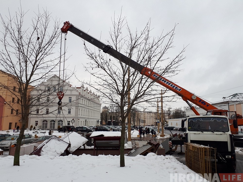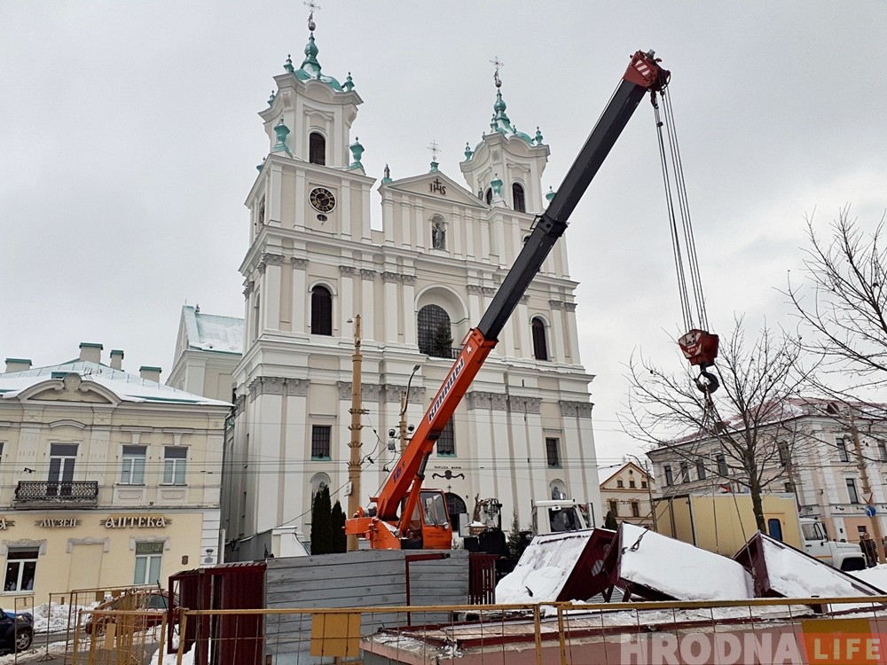 Демонтировать общественный туалет напротив Фарного костела начали 23 декабря. В течении нескольких дней постройку уберут, а подземные комнаты начнут засыпать. В будущем на месте туалета появятся клумбы с цветами.