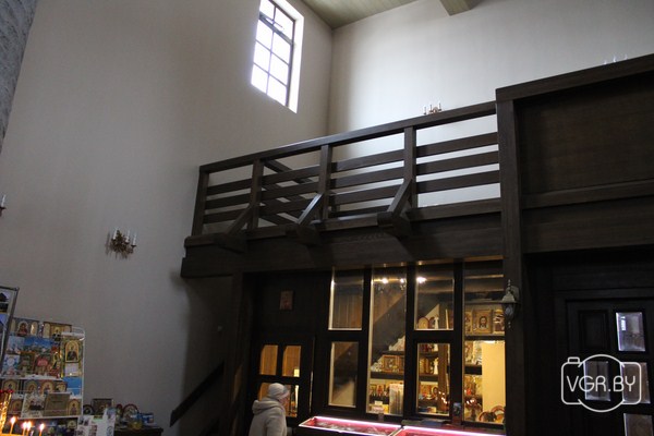 Входные двери заменены на более солидные. Справа от входа обновили лавку со свечками и церковной утварью. Балкон для певчих над входом переделали, использовали дубовые доски. Он стал чуть шире, чем был до ремонта. Наверх ведут подсвеченные аккуратные лестничные проёмы. На площадке для хора осталось сделать немного — вытереть пыль и расставить столики для певчих.