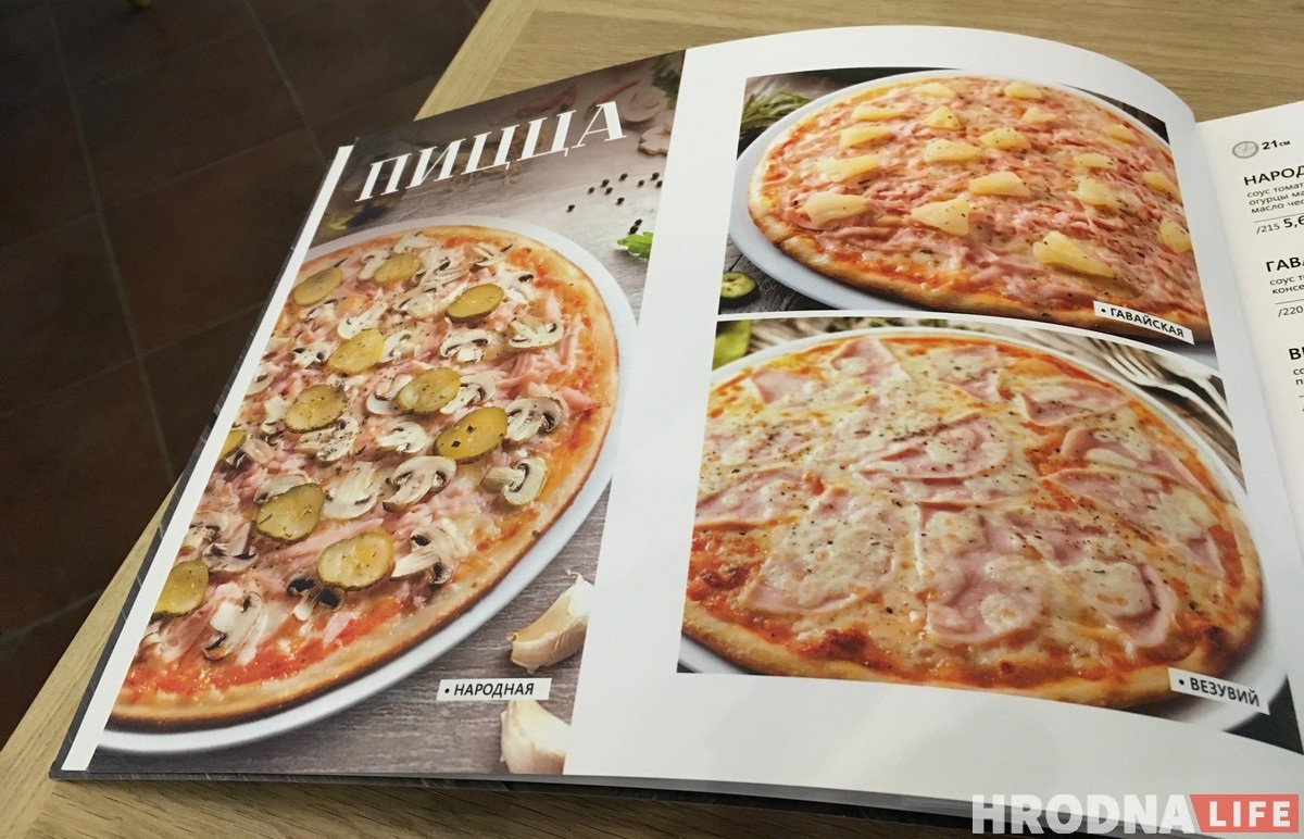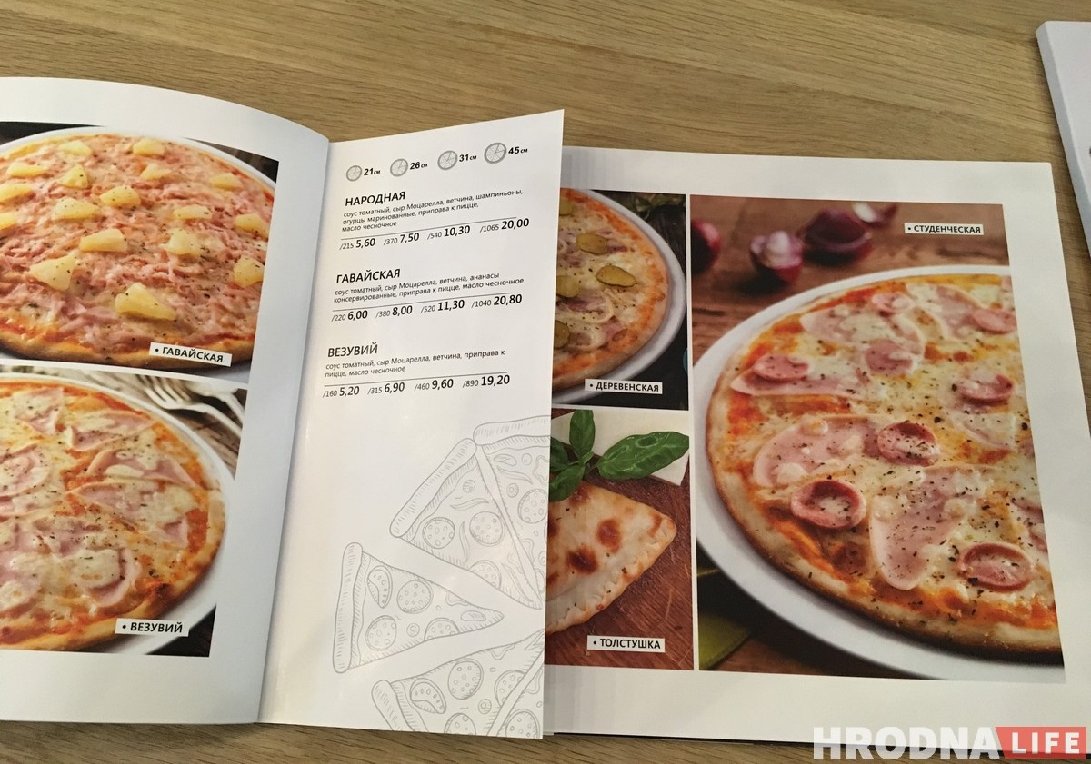 В ресторане более 28 видов пиццы четырех размеров: 21, 26, 31 и 45 см. Цены на маленькие пиццы начинаются от 4,2 руб. Самая большая пицца — 45 см — весит около килограмма.