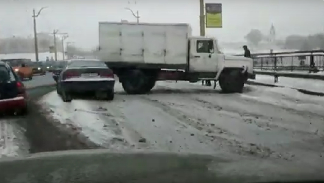 В пятницу 15 января из-за сильного снегопада в Гродно возросла аварийность. Около 14:00 на Старом мосту развернуло ГАЗ, который задел легковой автомобиль. Из-за ДТП в центре Гродно образовались большие заторы.