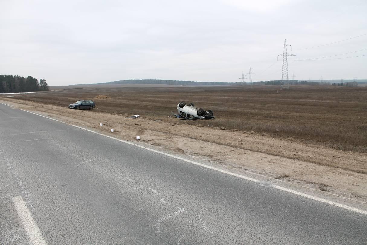 В поле оказались два «Фольксвагена» после вчерашнего столкновения в Волковысском районе. Один остался на колесах, второй лег на крышу, сообщает ГАИ Гродно.