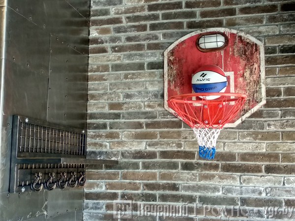 Отдельного упоминания заслуживает интерьер. Изобилие металла, стальных изделий вроде старых сантехнических труб или цепей, тёмные тона мебели и общий минимализм делают это место «мужским». В отделке использованы только натуральные, экологически чистые материалы. При оформлении барной стойки применялись 120-летние брусья, которые остались от старого снесённого дома в пятидесяти километрах от Гродно.