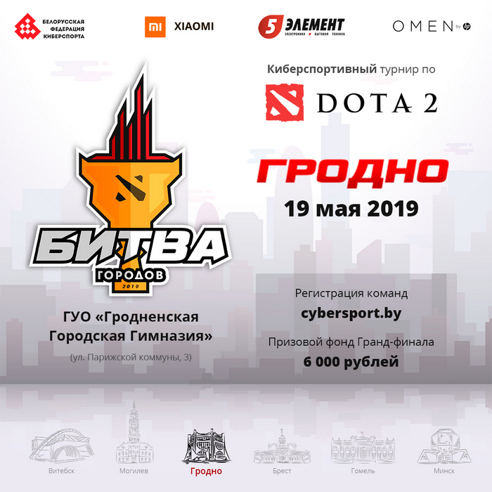 Белорусская федерация киберспорта совместно с сетью магазинов «5 элемент» объявила о проведении третьего этапа региональной серии «Битва городов». После Витебска и Могилева турнир в дисциплине Dota 2 примет Гродно. Чемпионат уже успел зарекомендовать себя как одно из крупнейших киберспортивных событий страны, пишет www.pressball.by.