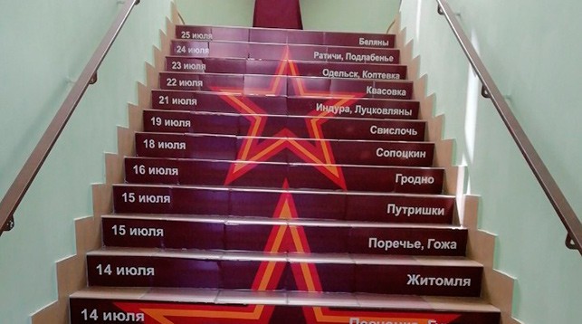 Таким образом посетителям библиотеки предлагают вспомнить историю июля 1944 года. На каждую из 16 ступеней лестницы нанесен один из населенных пунктов района и дата его освобождения. Первый в списке освобожденных Скидель. Сюда советские войска вошли 13 июля. 25 июля освобождение района завершилось взятием деревни Беляны.