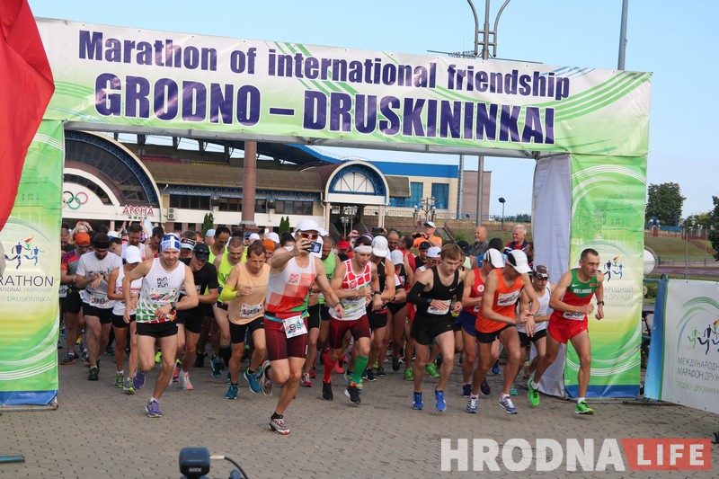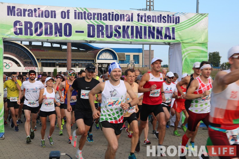 В восемь часов утром 14 июля участники «Марафона Дружба» стартовали из белорусского Гродно, чтобы финишировать в литовском Друскиникае. В этом году на старт вышли 144 марафонца из 11 стран мира. Среди них 115 мужчин и 29 женщин. Наибольшее количество любителей бега из Беларуси — 106. Далее следуют Литва, Польша, Россия и Украина.