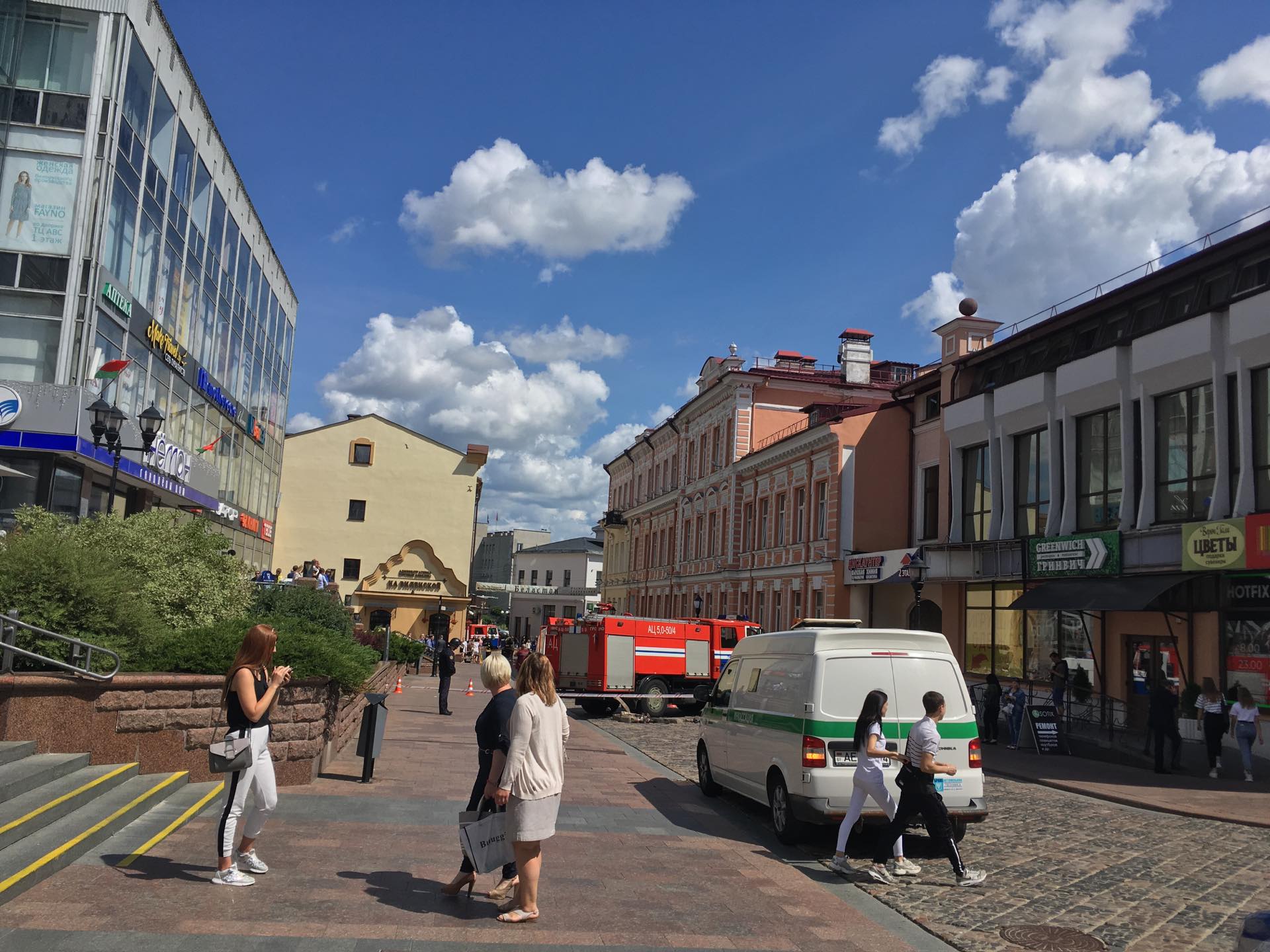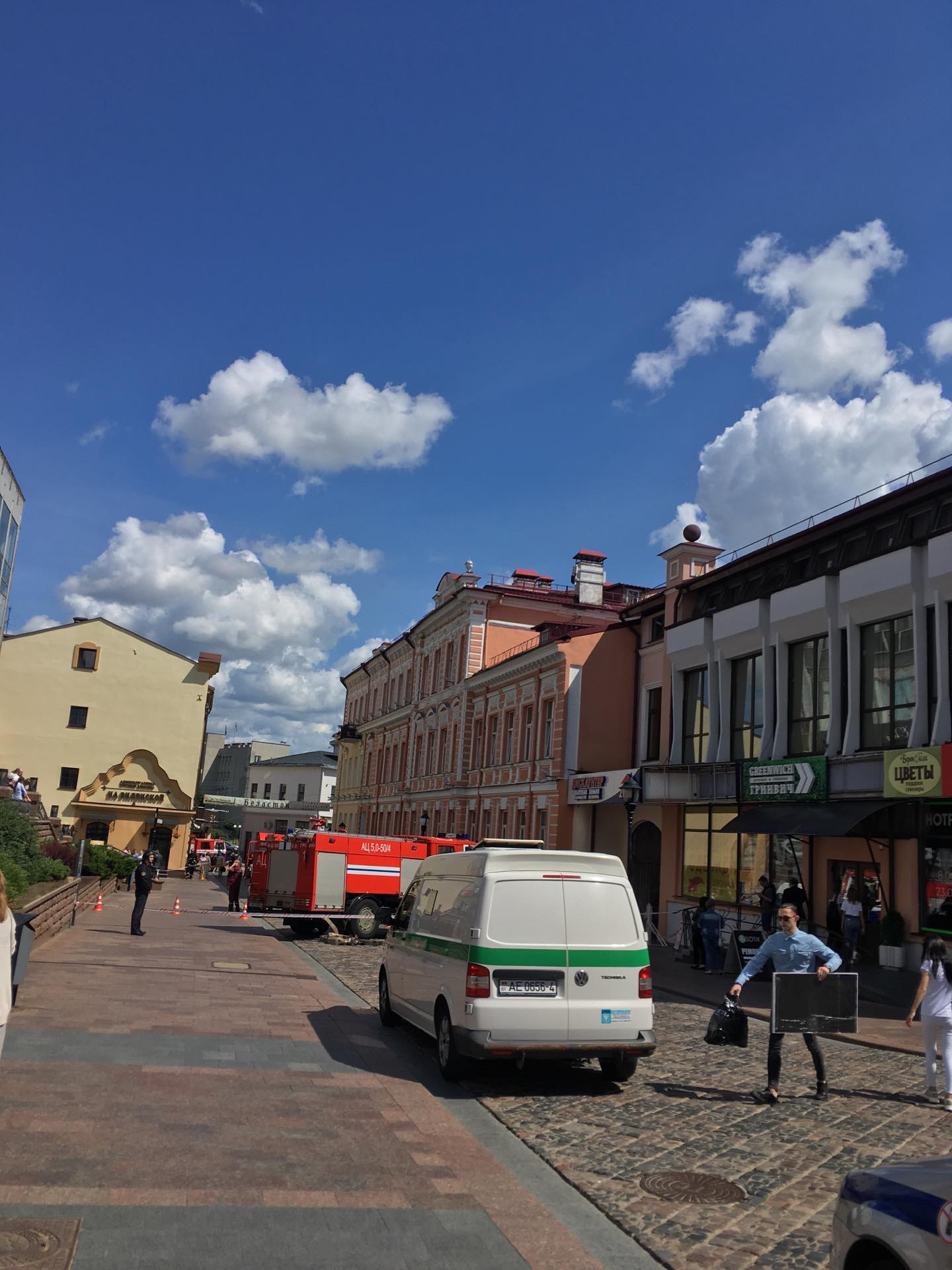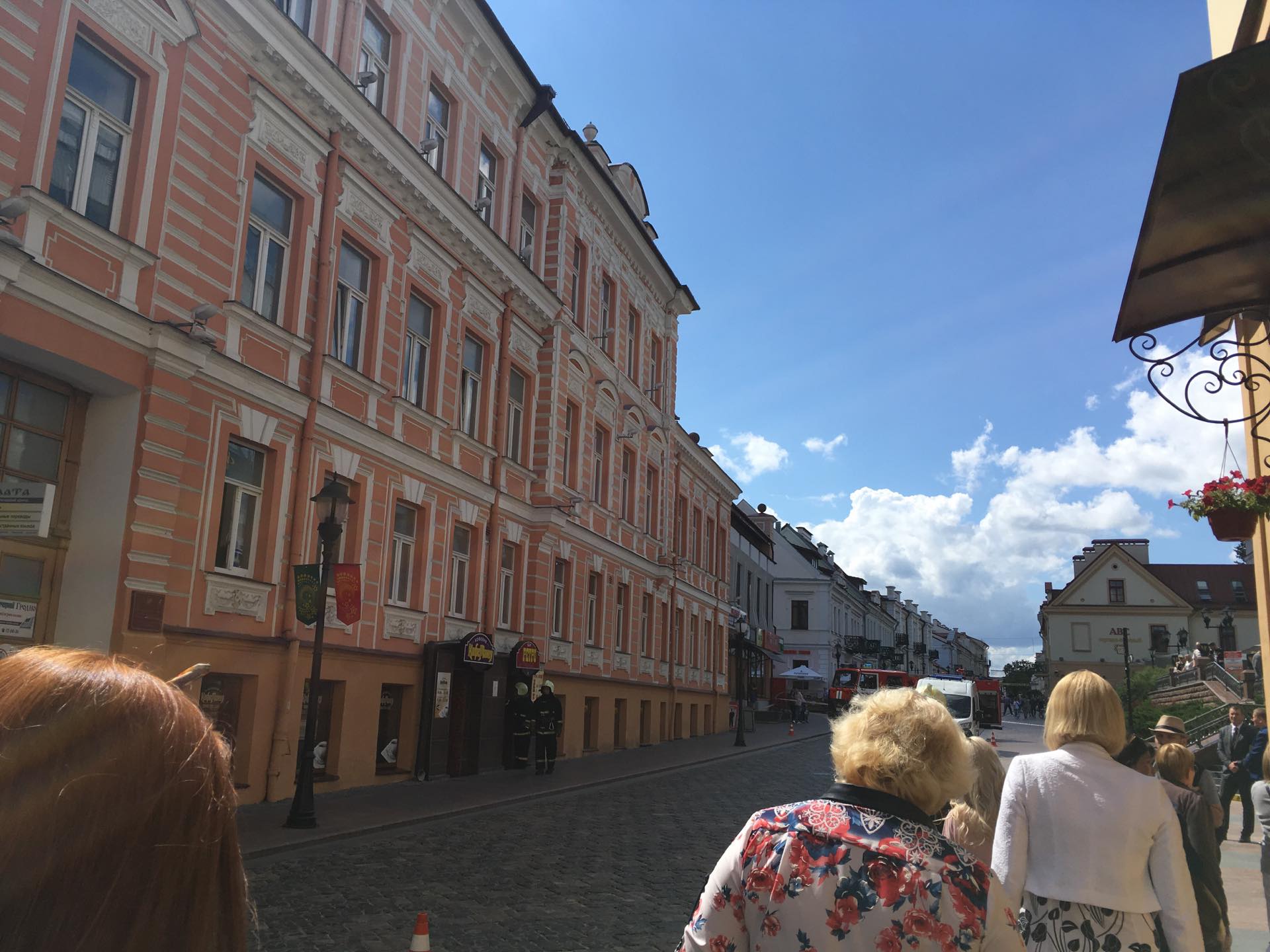 Около 12.30 читатели сообщили, что центр города перекрыли. Здесь работают две пожарные машины и одна скорая.