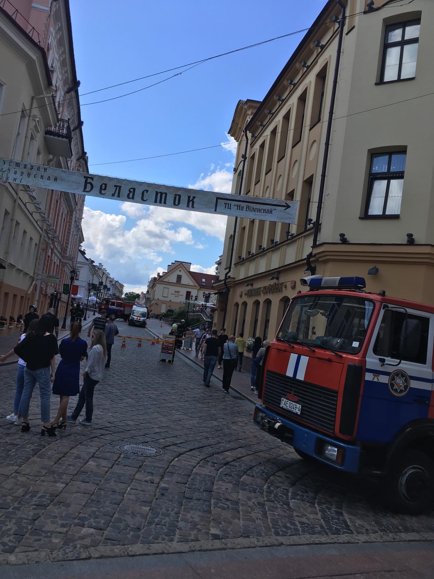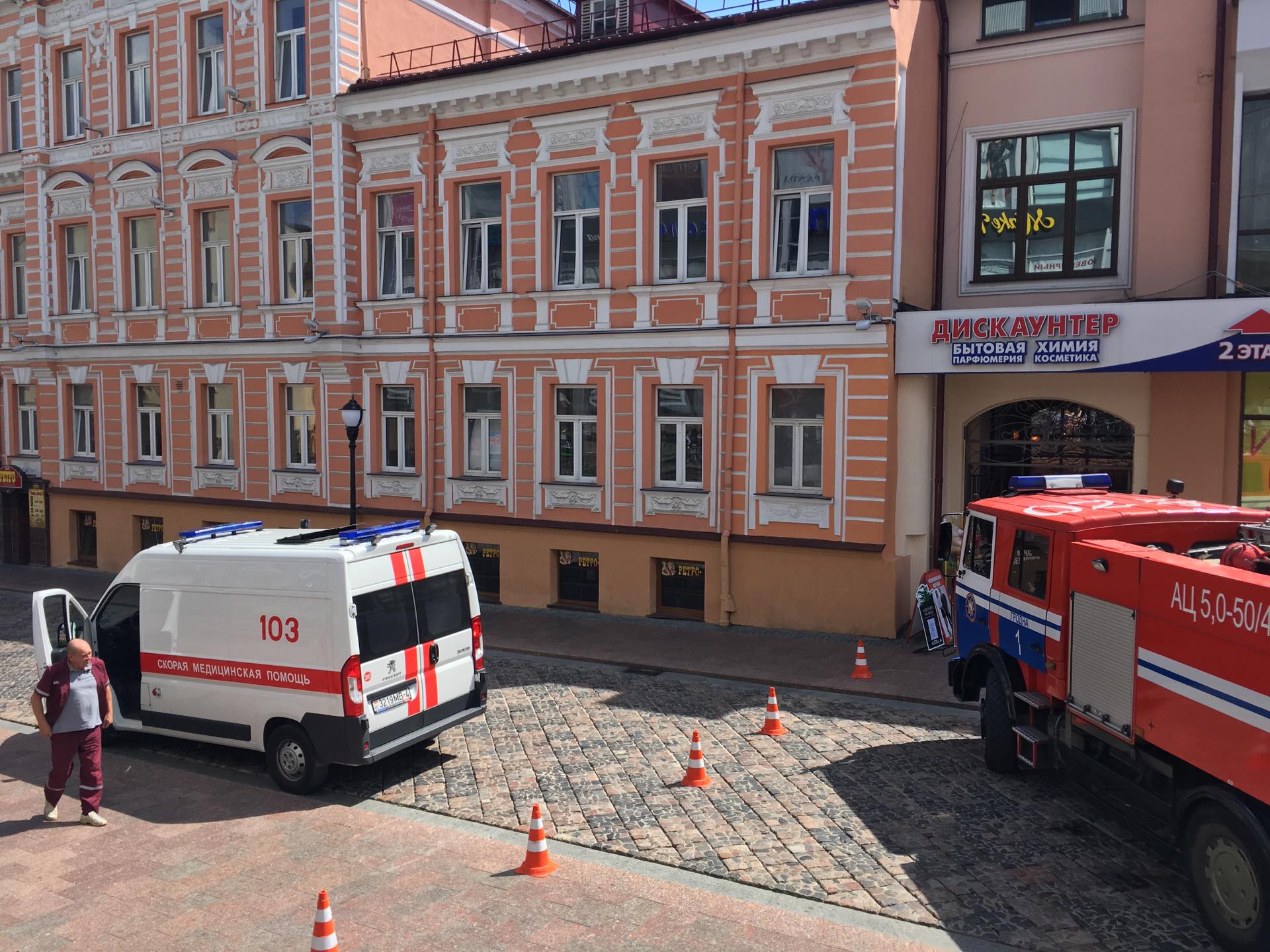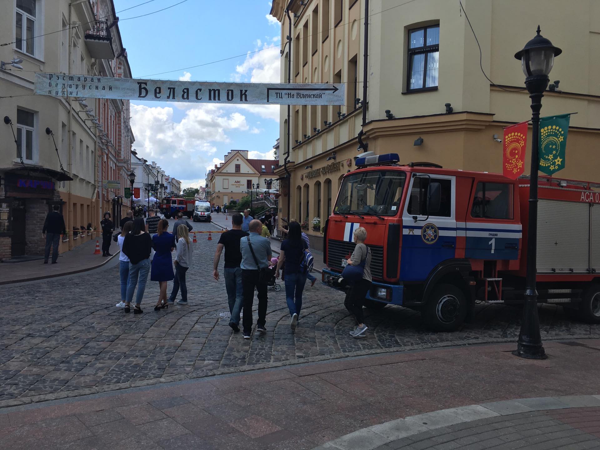 Около 12.30 читатели сообщили, что центр города перекрыли. Здесь работают две пожарные машины и одна скорая.