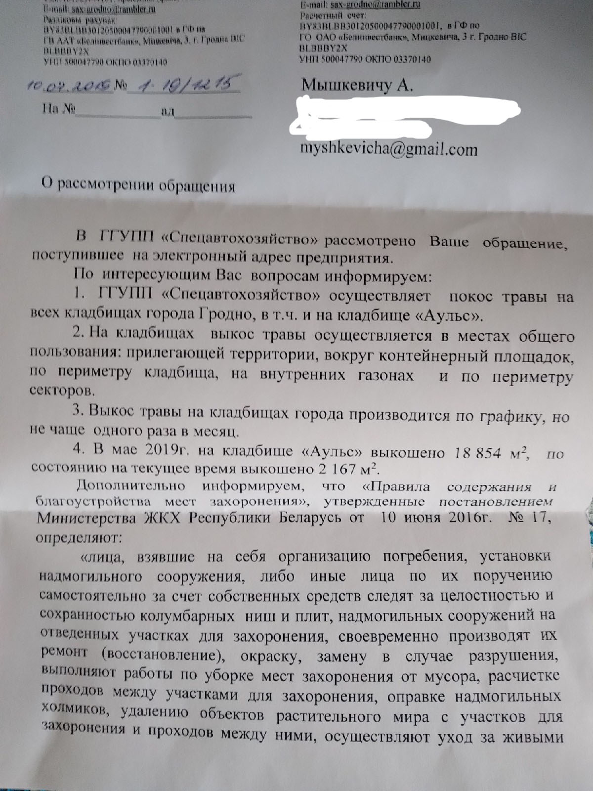 Гродненский активист Анатолий Мышкевич забеспокоился состоянием кладбища Аульс. Он туда приезжает на могилы к родным и говорит, что весь летний сезон там огромные заросли, которые не косят. Активист отправил запрос в Спецавтохозяйство, чтобы они ответили, как часто и кто должен осуществлять покос.
