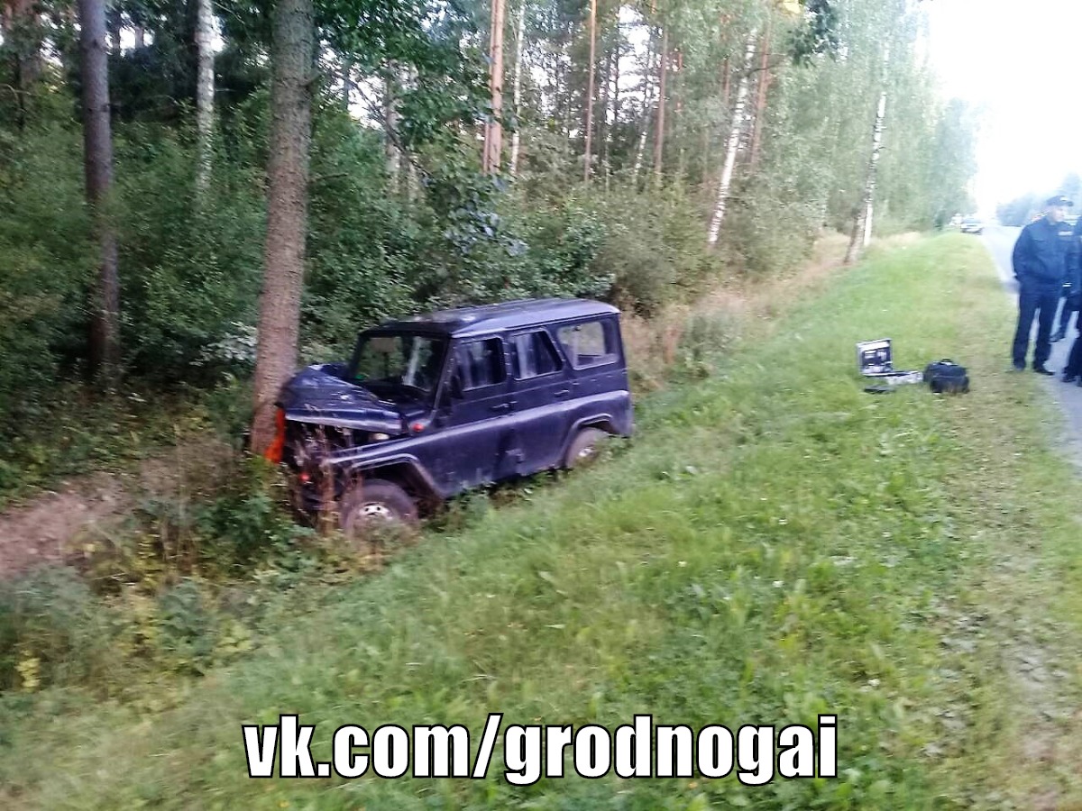 ГАИ вдали на прямом протяженном участке заметили угнанный автомобиль и поспешили за ним. Выехав из Ивья, при подъезде к объездной дороге водитель не снизил скорость перед искусственными неровностями, потерял управление и съехал в кювет, где ударился в придорожное дерево.