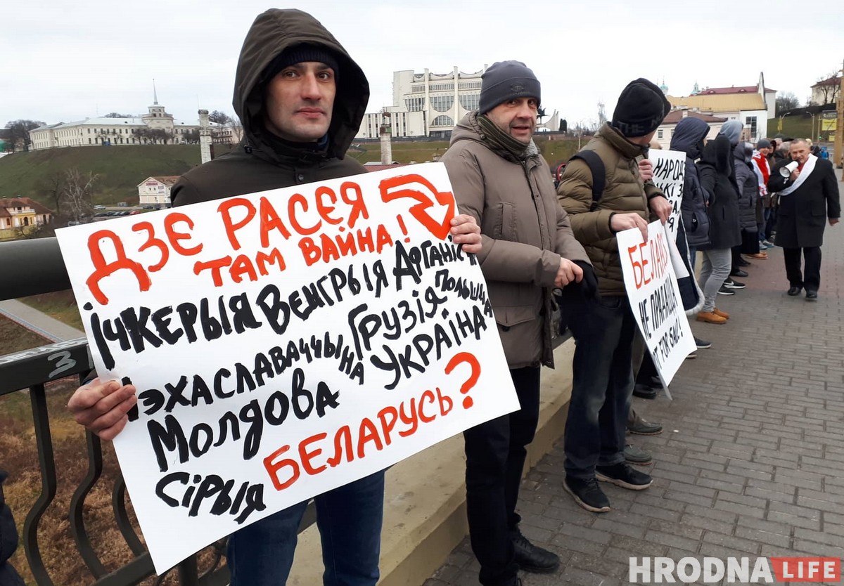 Около 70 человек собралось в 15.00 на Старом мосту в Гродно, чтобы выразить свое несогласие с «углубленной интеграцией» Беларуси и России, в результате которой Беларусь может потерять независимость.