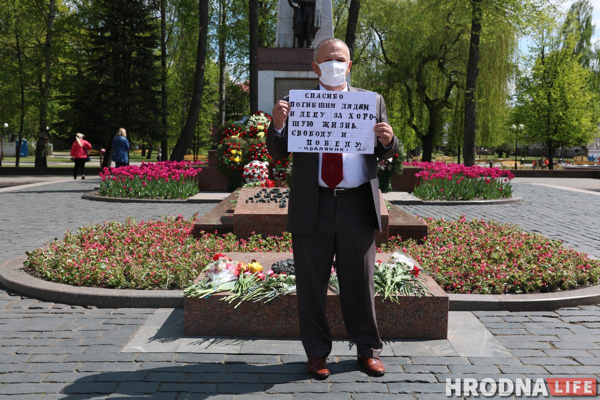Гродненский активист Николай Саляник, заручившись поддержкой родственников и журналистов, также пришел возложить цветы. Уже традиционно в этот день за активистом следят сотрудники милиции. В этот раз обошлось без задержаний. Саляник возложил цветы и около минуты простоял с плакатом, в котором поблагодарил своих родственников за победу в войне.