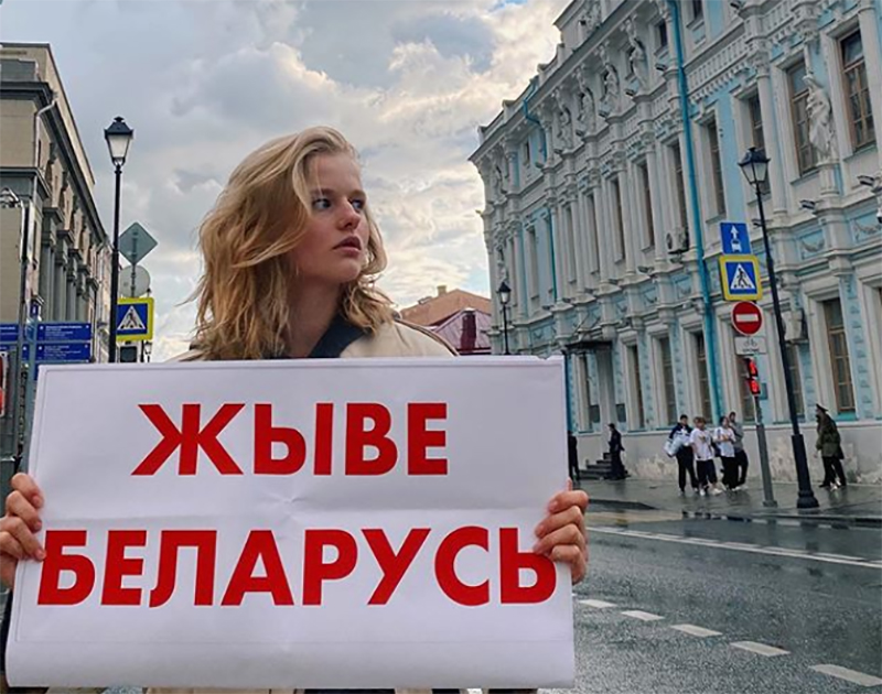 Она вышла с пикетом к посольству Беларуси в Москве с плакатом «Жыве Беларусь» и разместила пост  в Instagram.