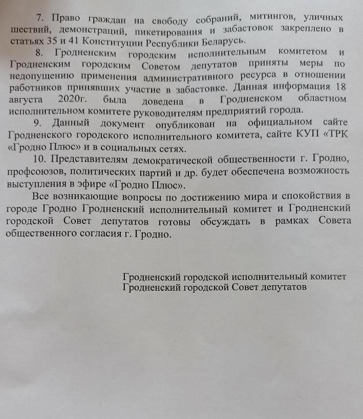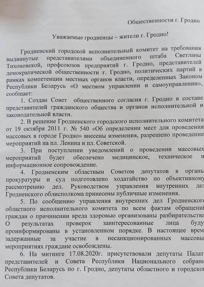 Представителям общественности Гродно после встречи у губернатора передали решение горисполкома разрешить массовые мероприятия на площади Ленина, Советской и в Коложском парке, а также письмо, адресованное общественности города.