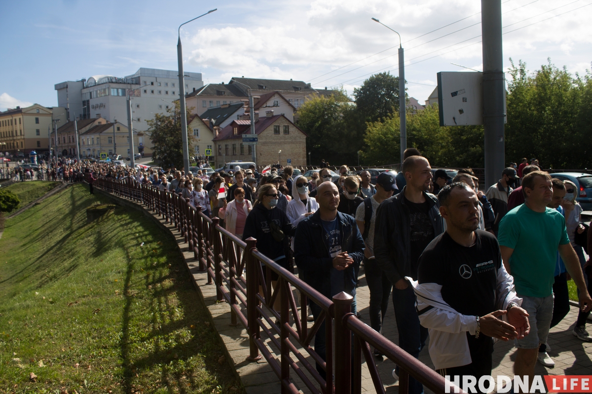 Гродненцы собрались около 14.00 13 сентября на Советской улице возле молодежного центра «Гродно». Люди пришли с плакатами, цветами и флагами. Они скандировали «Это наш город!», «Гродно, выходи!» И «Жыве Беларусь!». Гродненцы сформировали колонну, во главе которой встали работники «Химволокно», и пошли маршем через Большую Троицкую на улицу Горького.