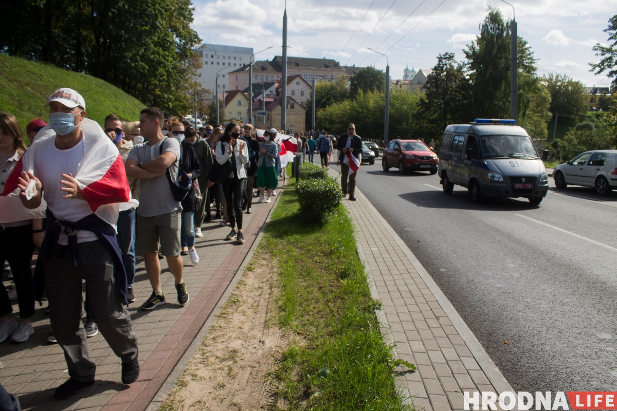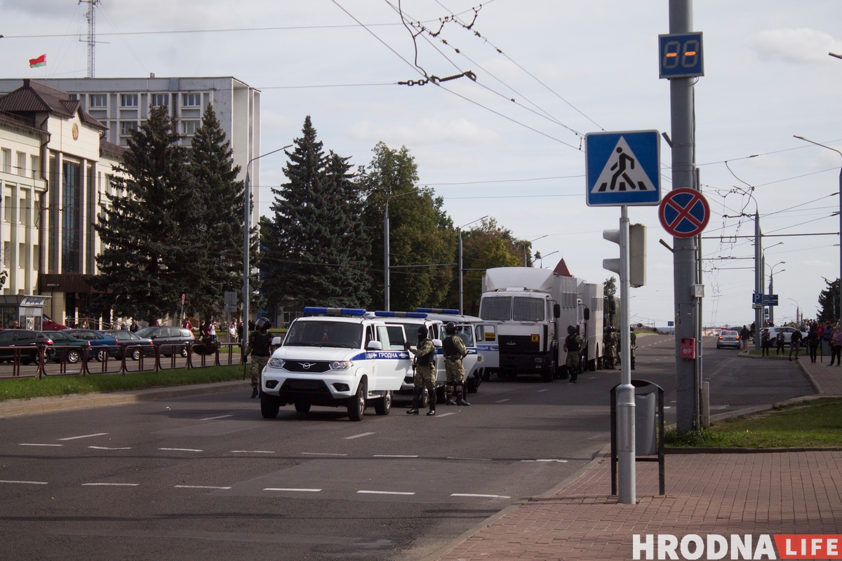 Автомобили несколько раз останавливались, чтобы дать протестующим пройти. По городу ездили автозаки, микроавтобусы и автобусы с ОМОНом. Гродненцы смогли дойти до кинотеатра «Космос». По обе стороны улицы остановились несколько автозаков, микроавтобусов и автобусов с ОМОНом. Всего журналисты насчитали около 100 сотрудников ОМОНа и военных.