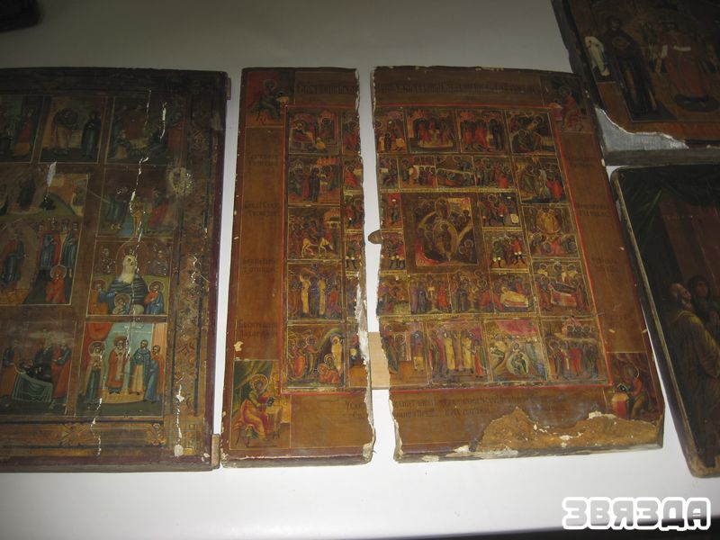 Она рассказала, что икона попала на реставрацию для укрепления верхнего «золотого» слоя. Такая процедура делает краску более прочной. Когда специалист начала проводить укрепление, она столкнулась с определенными трудностями — поверхность не поддавалась никаким методам. А когда сняла верхнюю краску, вдруг проступило еще одно, нижнее письмо. Тогда реставраторский совет принял решение перенести верхний слой на другую основу, для того чтобы сохранить оба изображения. Нижний список неплохо сохранился, правда, он темный, но хорошо читаются лики святых — в центре виден Христос, Божья Матерь, Николай-Чудотворец, другие святые. Верхний слой будет собран на второй доске. Он собирается как мозаика — каждый кусочек переносится отдельно.