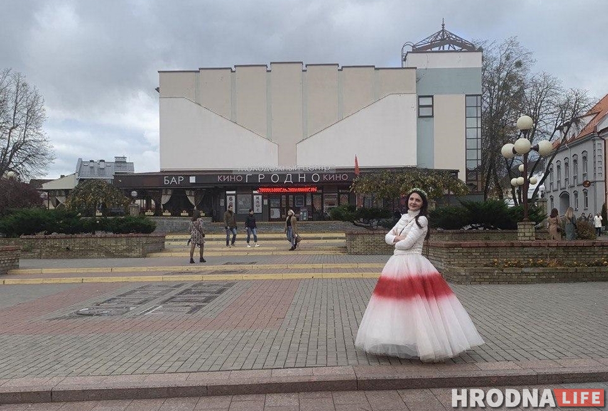 Инна Зайцева прославилась на маршах протеста в Минске благодаря своему бело-красно-белому свадебному платью. 31 октября Инна приехала в Гродно поддержать протестующих и уволенных сотрудников «Азота». Ее задержали сотрудники милиции, когда она возвращалась в столицу.