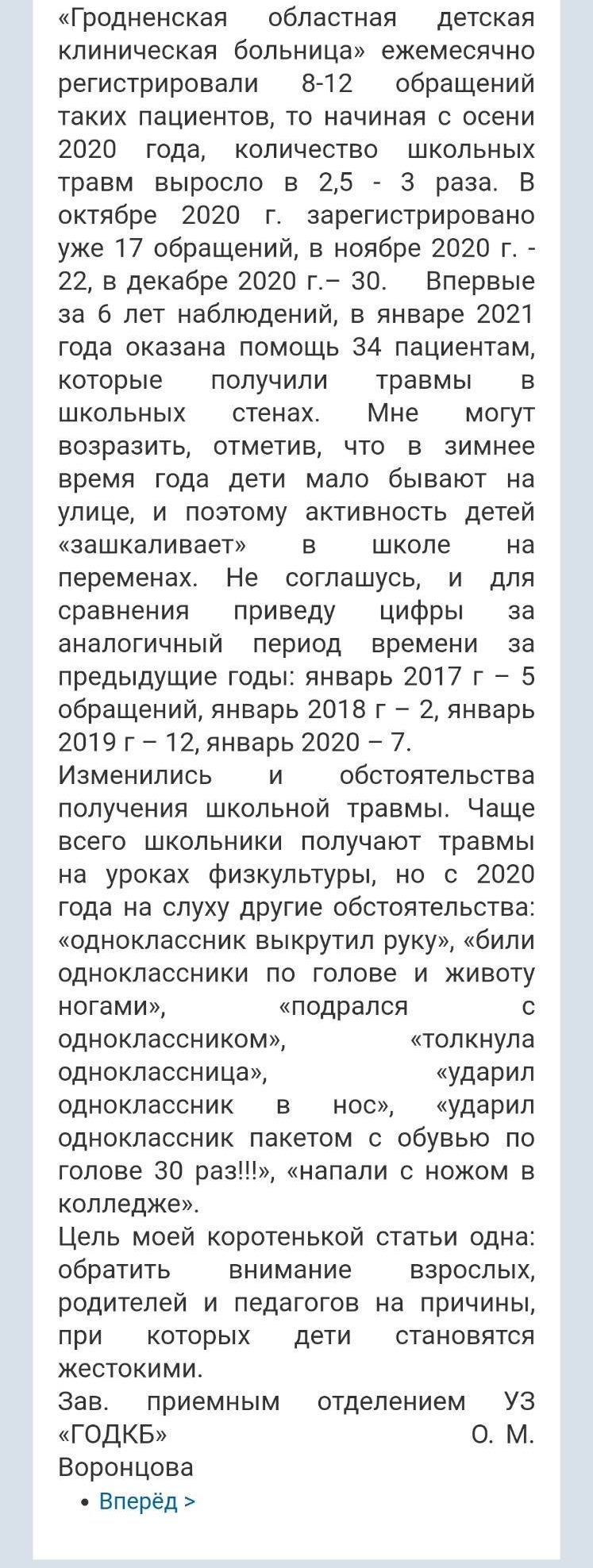 Статистика по школьным травмам начиная с осени 2020 года резко пошла вверх. Число таких обращений в Гродненской областной детской клинической больнице увеличилось в три раза. Сообщения о жестокости одноклассников стали чаще встречаться среди причин получения повреждений у детей.