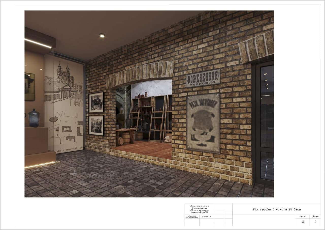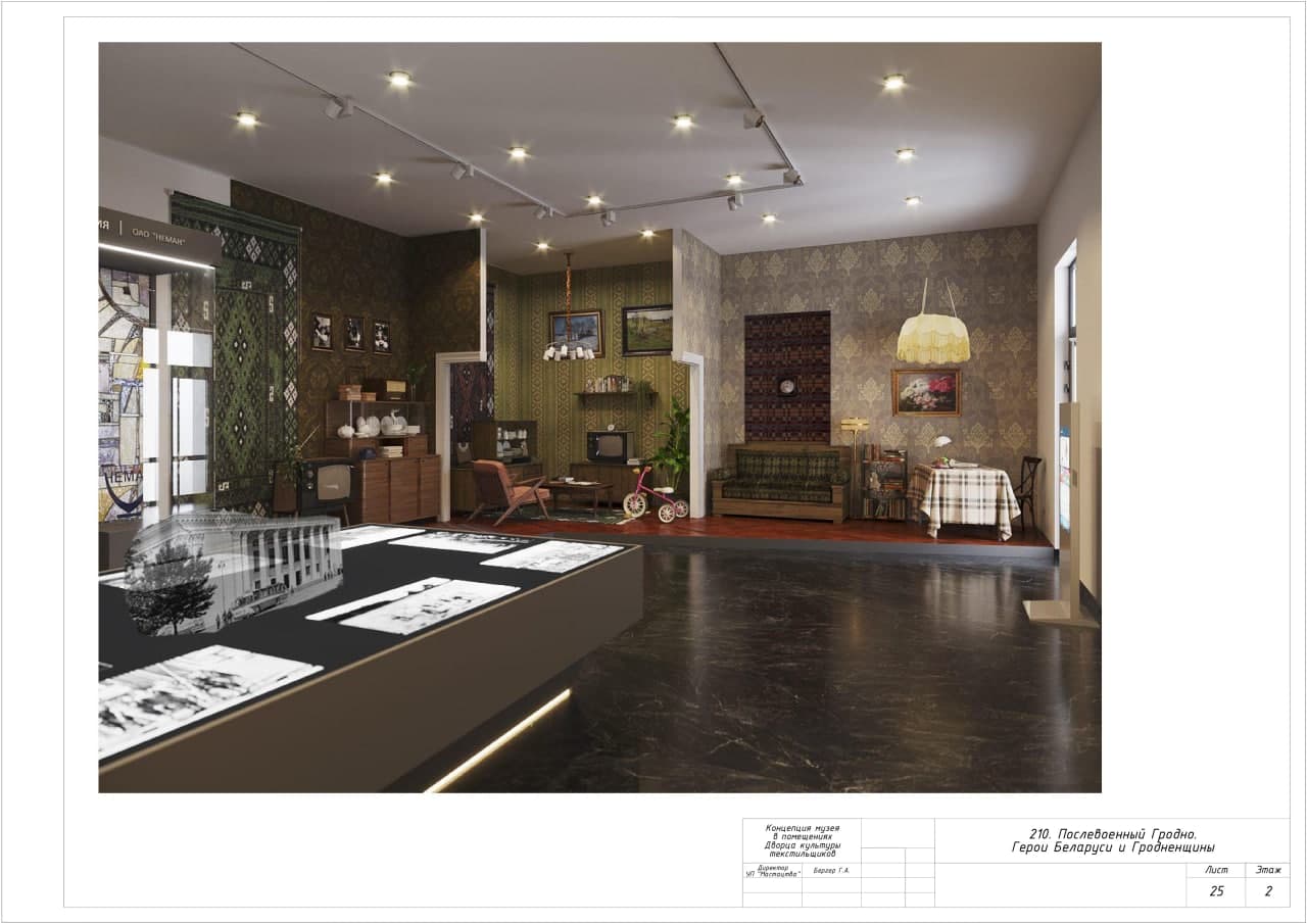 Концепцию будущей экспозиции в бывшем Дворце текстильщиков разрабатывал Гродненский историко-археологический музей. Зимой 2021 года даже появились рендеры, как будут выглядеть залы нового музея. Сейчас насчет открытия экспозиции ничего неизвестно — проект стоит на паузе, рассказал Hrodna.life директор Гродненского историко-археологического музея Юрий Китурко. На этот год нет финансирования, уточнил он.