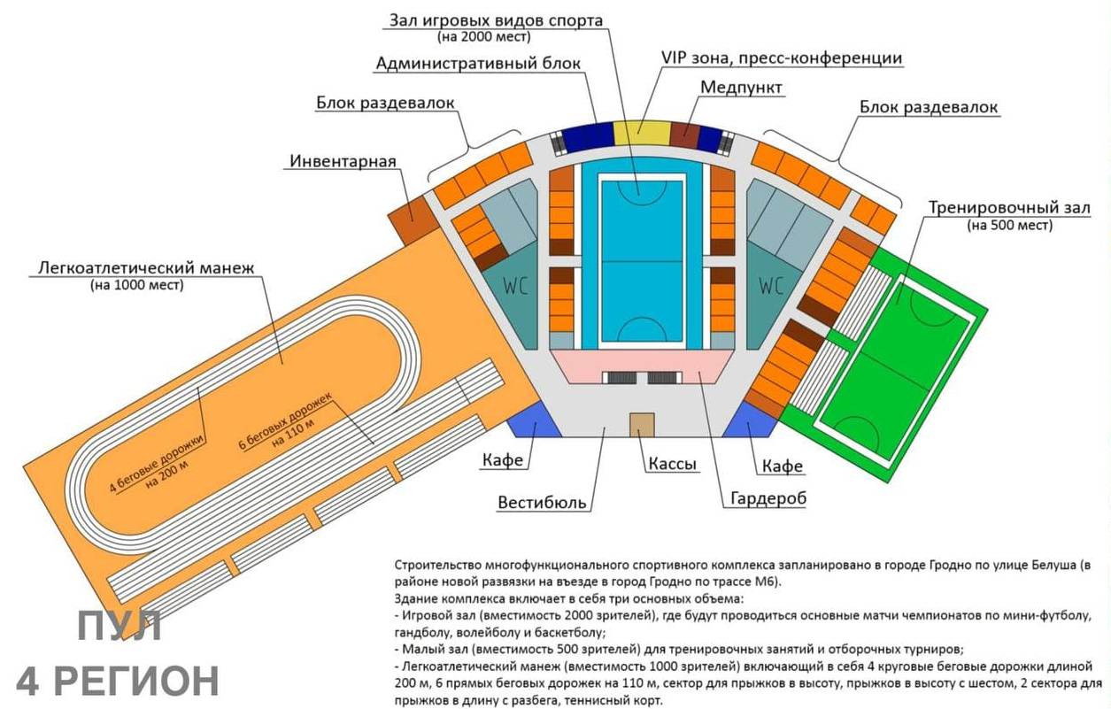 Здание комплекса будет состоять из трех основных объемов, пишет Telegram-канал, близкий к гродненскому облисполкому. Игровой зал рассчитывают на 2 тысячи зрителей. В нем будут проходить основные матчи чемпионатов по мини-футболу, гандболу, волейболу и баскетболу. Малый зал сможет вместить около 500 зрителей. Его отведут для проведения тренировочных занятий и отборочных турниров.