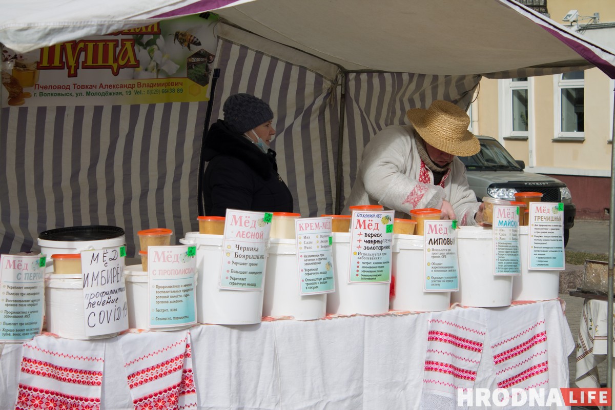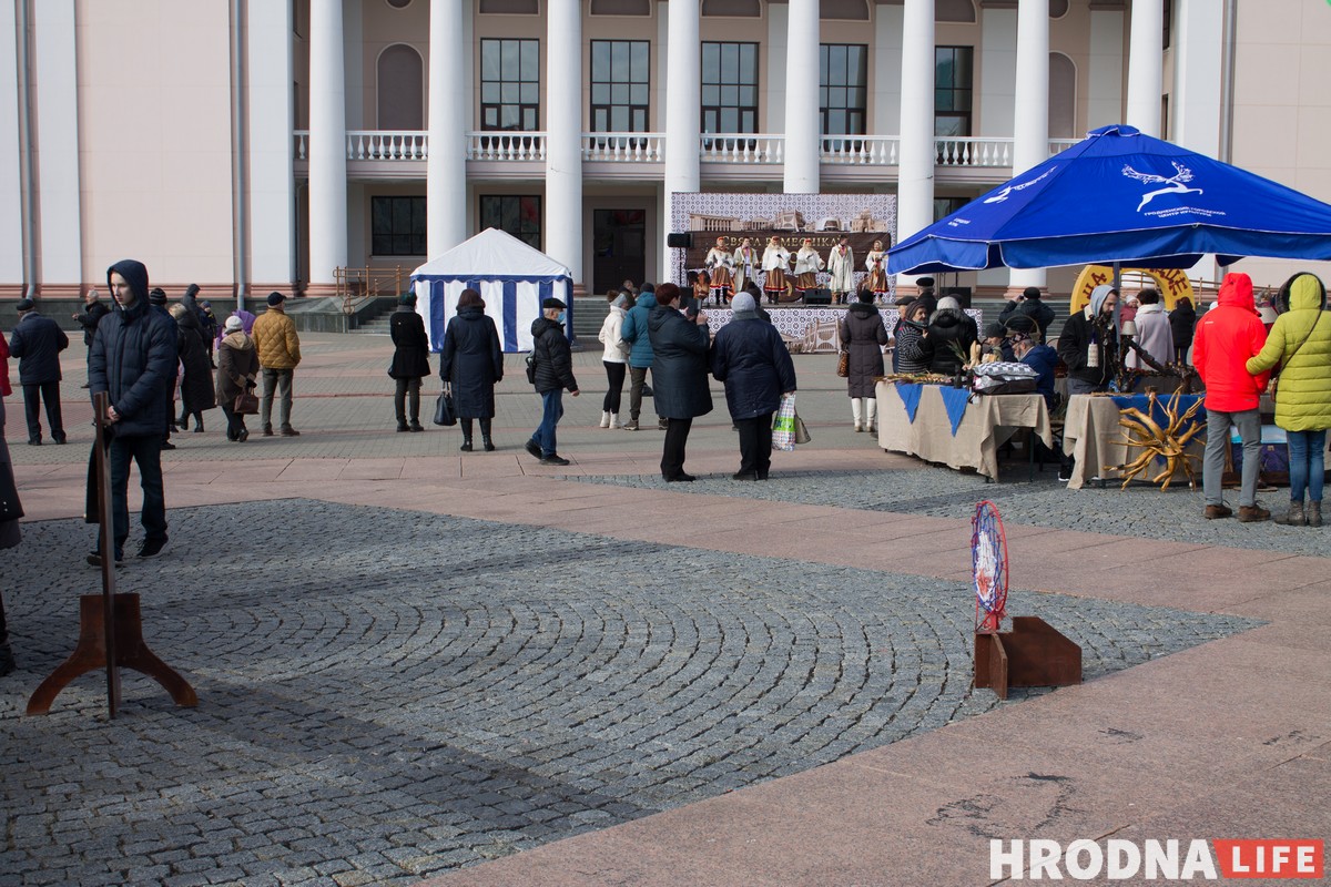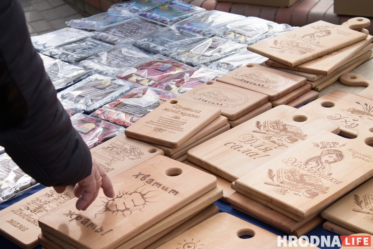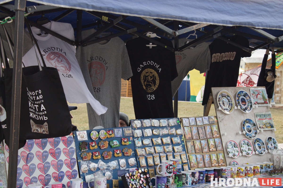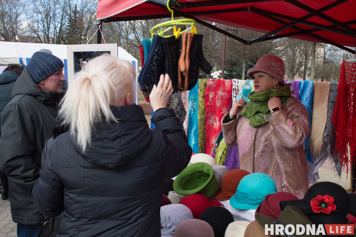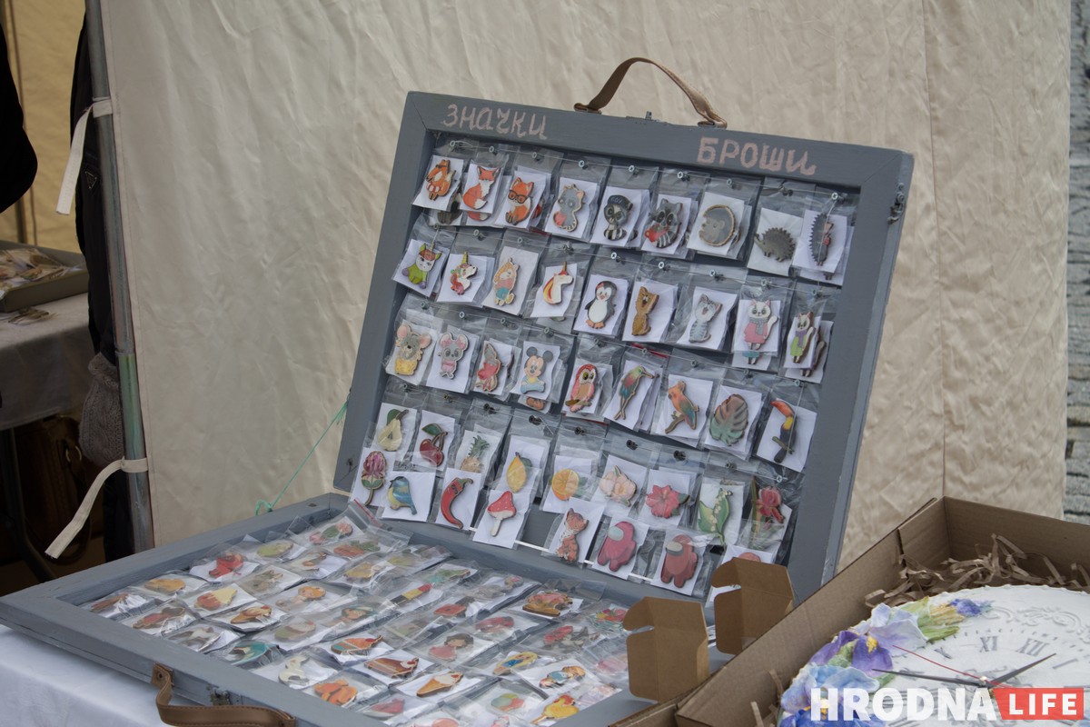 На площади разместилась ремесленная выставка. Мастера предлагали изделия из дерева, вязаные игрушки, кукол и украшения. Рядом с Гродненскими ремесленниками торговали и приезжие — как минимум, из Свислочи и Слонима.