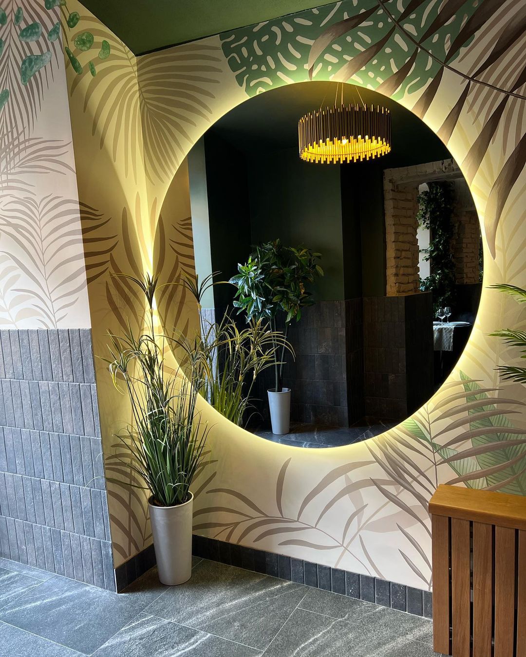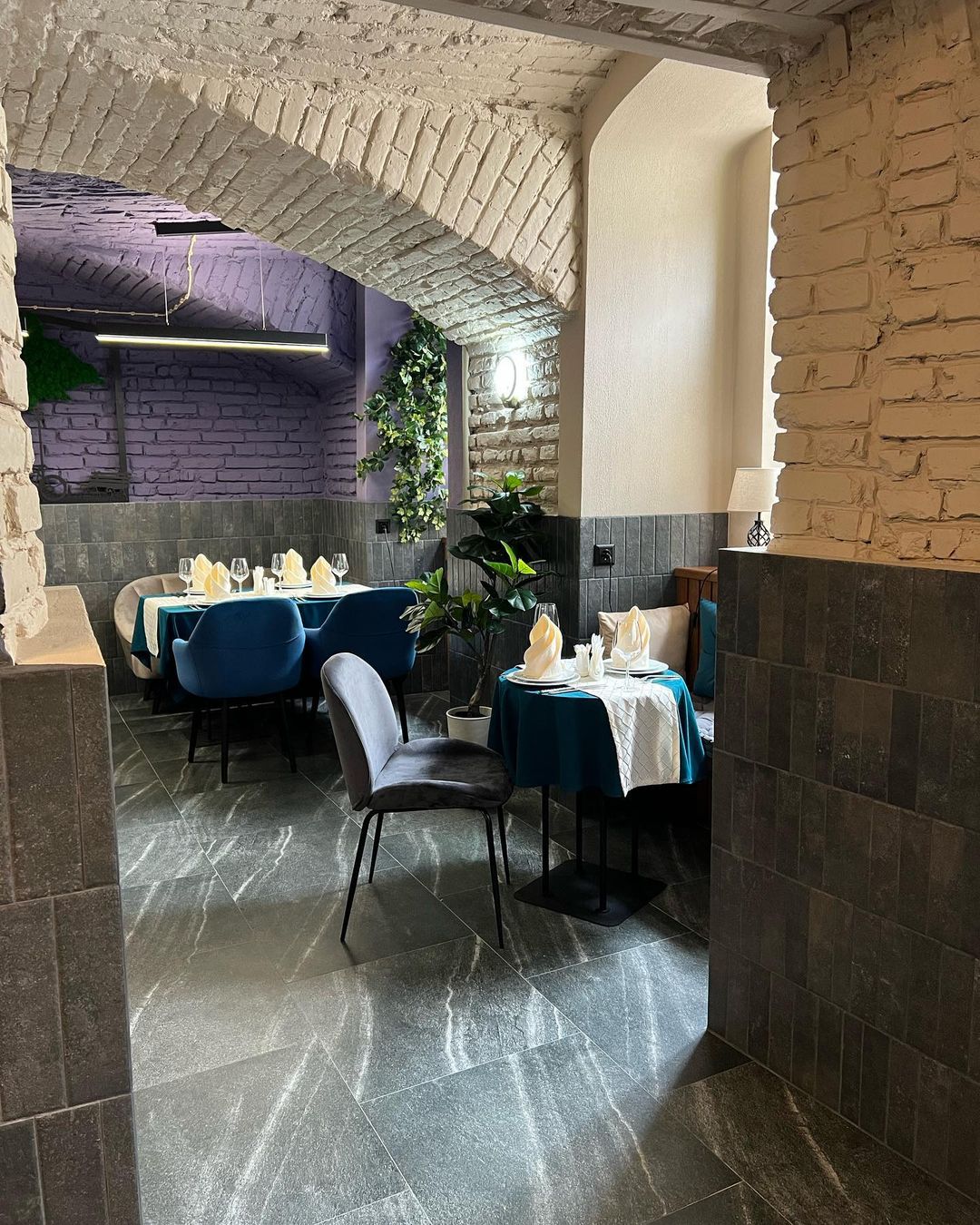 Заведение позиционирует себя как место для семейного отдыха, хотя в пятницу-субботу открыто до 2:00. В интерьере сохранили кирпичные стены, арки и своды, добавили много искусственной зелени и больших зеркал. Цветом обеспечили зонирование.