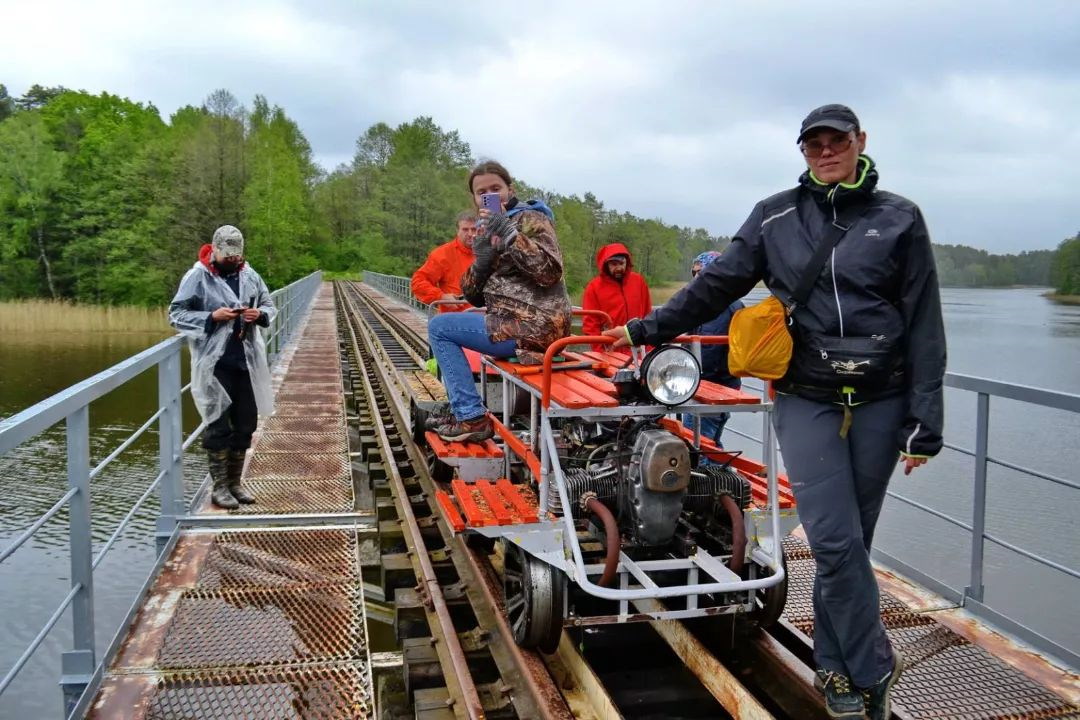 В республиканском ландшафтном заказнике “Озеры” под Гродно теперь можно прокатиться на настоящей дрезине по узкоколейке. Маршрут проходит по мосту через Белое озеро и ведет на Святое болото, где шли бои повстанцев и царской армии в 1863−1864 годах. Информация взята из открытых источников.