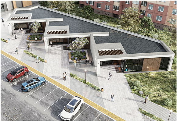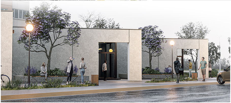 Комплекс нового торгового центра появится рядом с существующим магазином «Грошык» на Богушевича, 40. Здания будут выполнены в стиле минимализма: цемент, много стекла, керамогранит. Если верить проекту, пространство рядом собираются озеленить, установить лавочки. Также проект предусматривает создание безбарьерной среды.