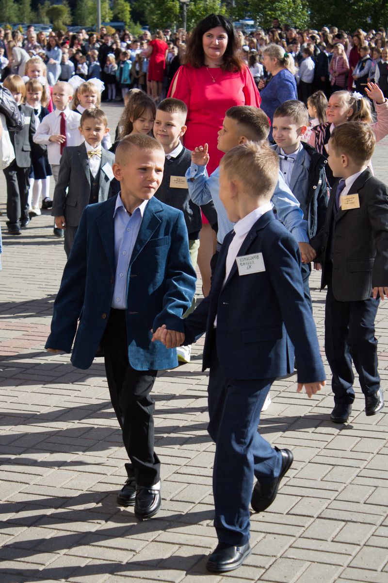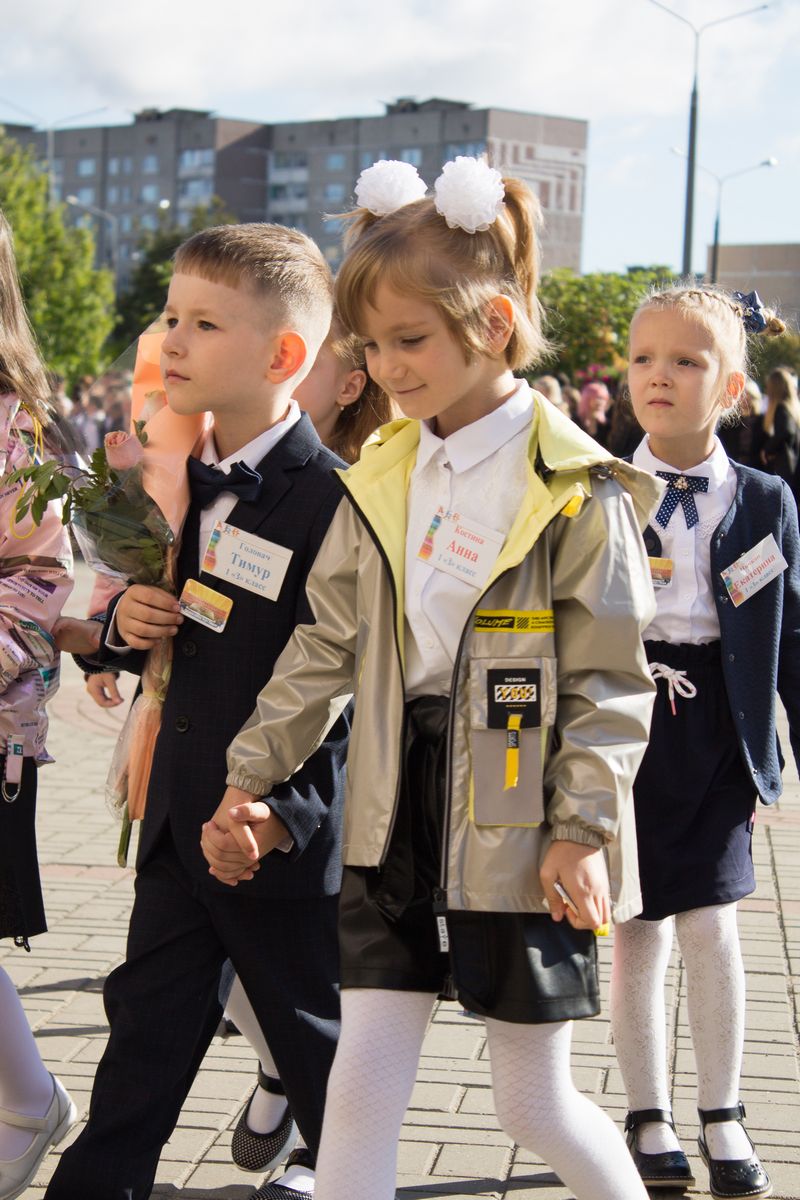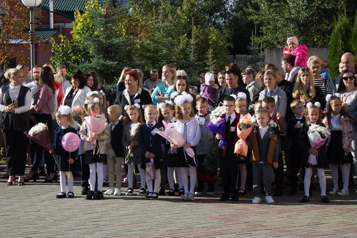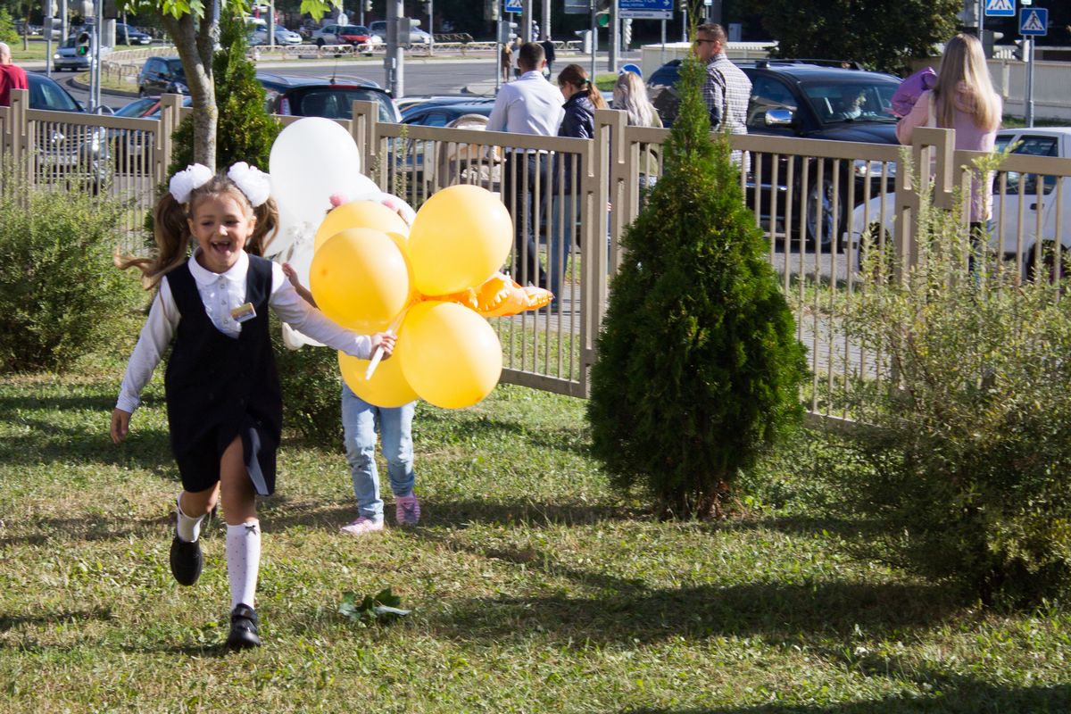 Линейка перед зданием школы началась с торжественного выхода первых классов, выноса государственного флага и прослушивания гимна. Директор школы Александр Римша поздравил школьников с праздником. Он пообещал, что детей ждут не только уроки, но спортивные и развлекательные мероприятия.