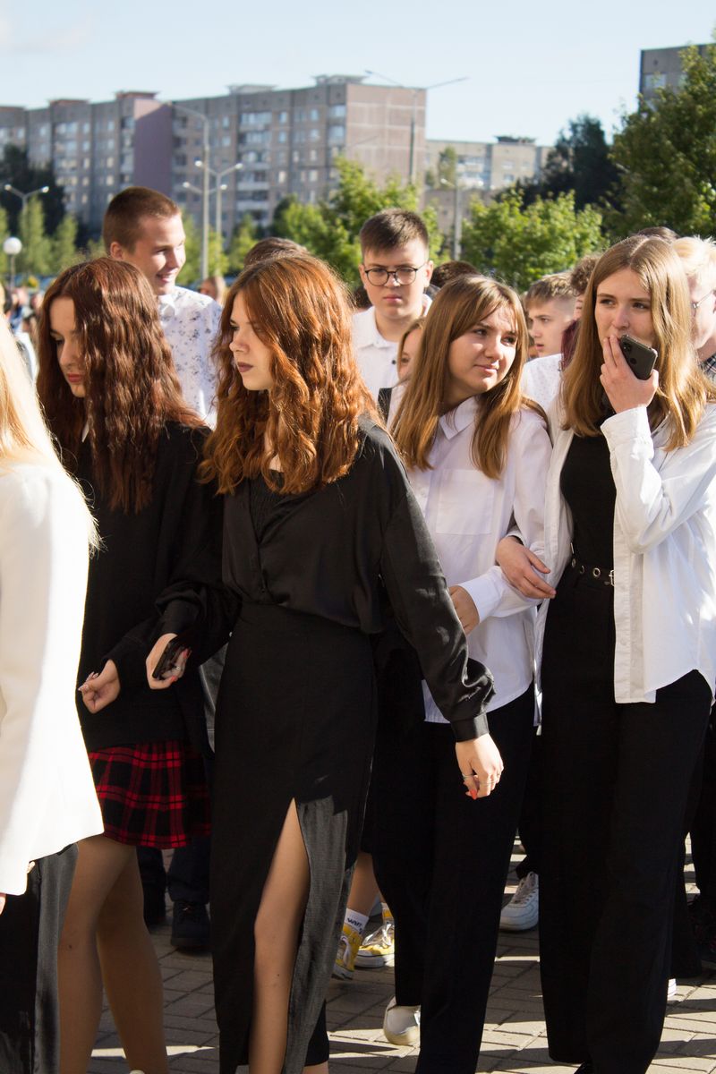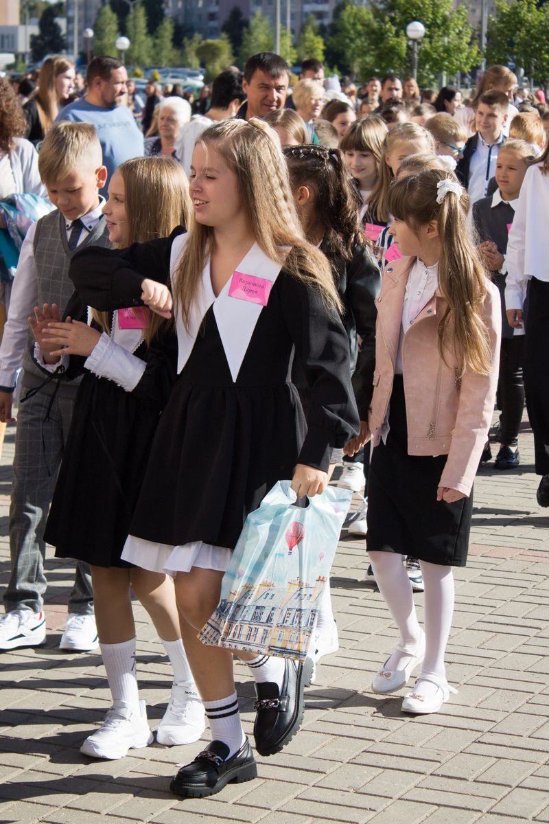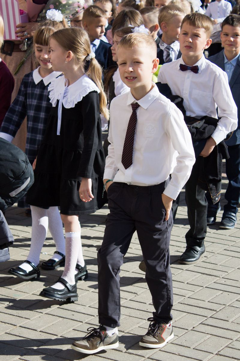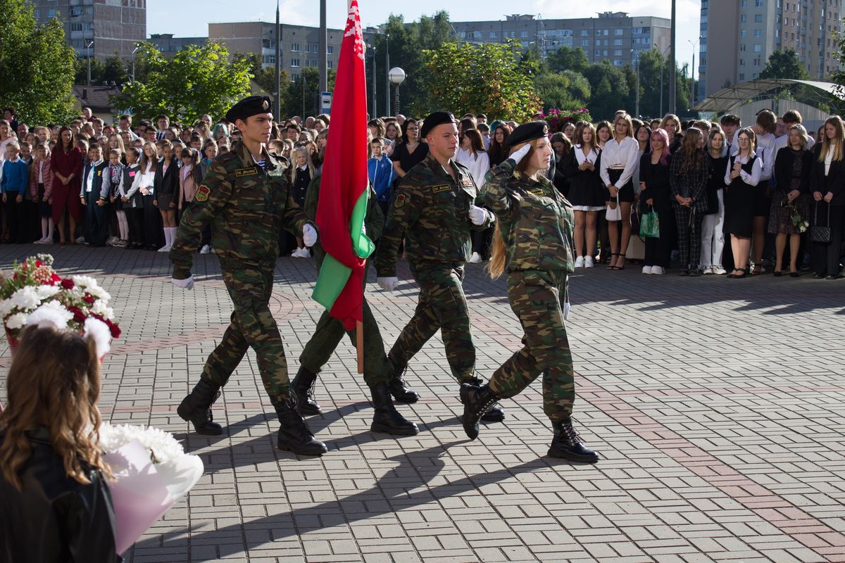 Линейка перед зданием школы началась с торжественного выхода первых классов, выноса государственного флага и прослушивания гимна. Директор школы Александр Римша поздравил школьников с праздником. Он пообещал, что детей ждут не только уроки, но спортивные и развлекательные мероприятия.