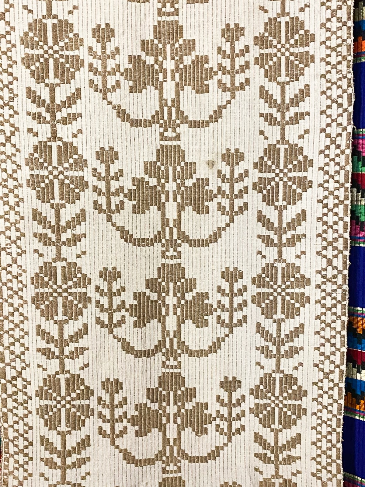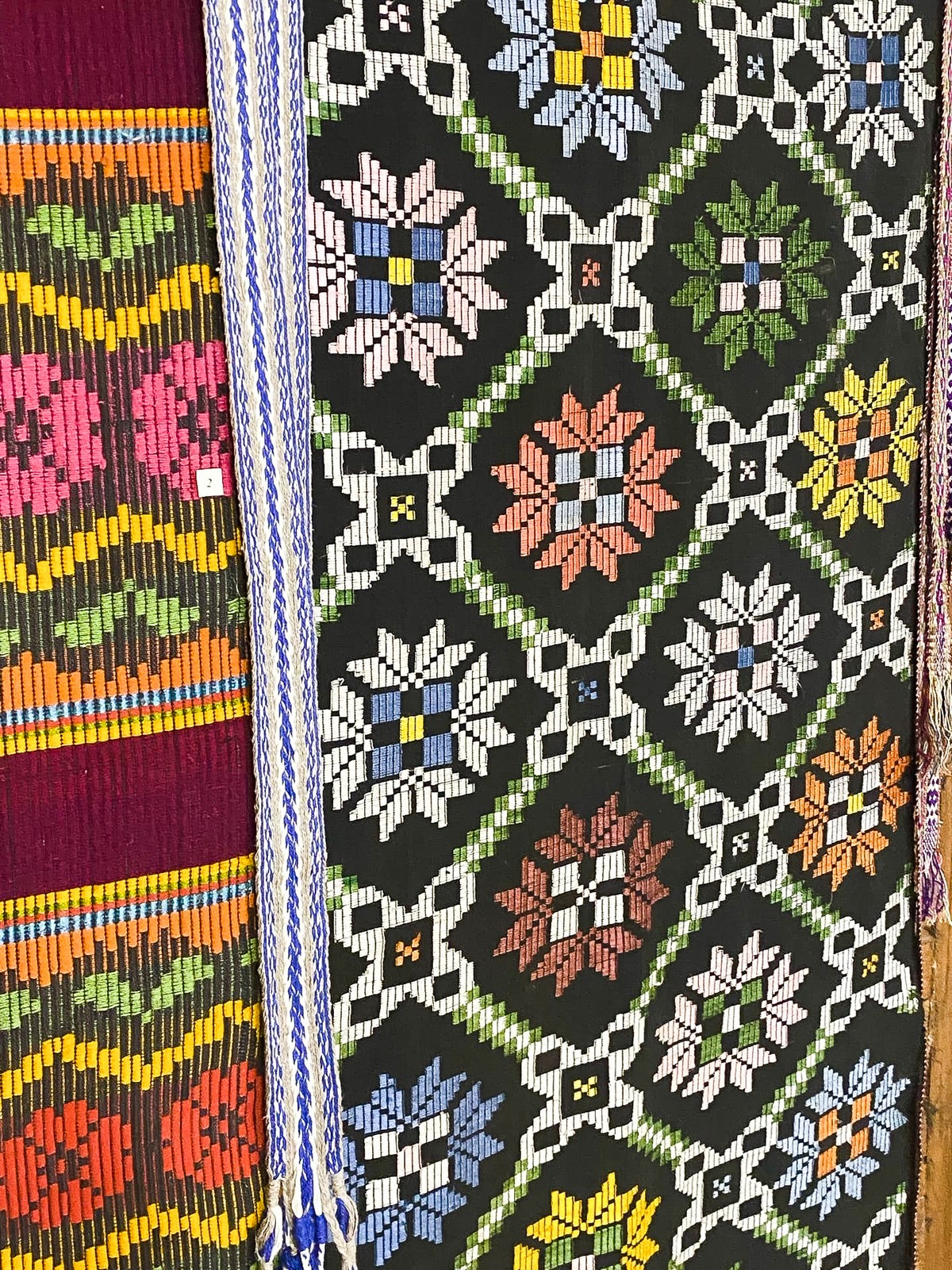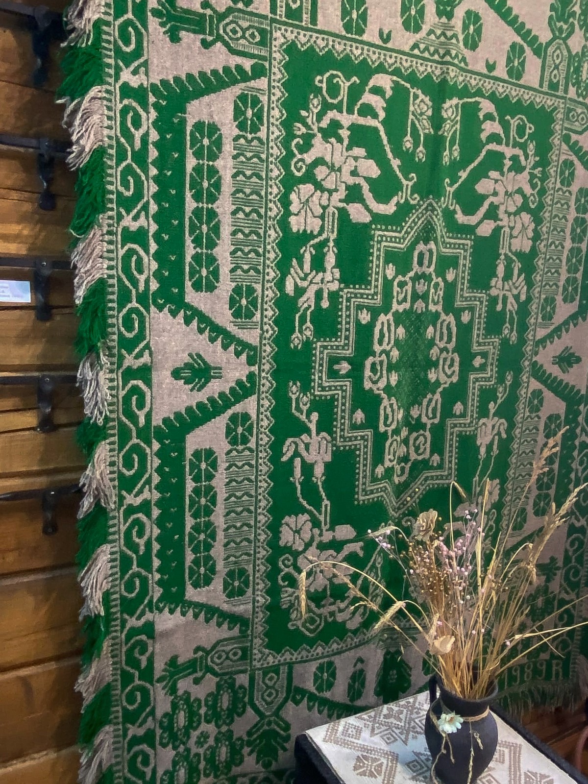 Здесь представлен самотканый ковёр из деревни Почуйки Волковысского района. Рядом представлен ковёр в зелёных и белых цветах известной мастерицы из Одельска Ядвиги Райской, сотканый в 1989.