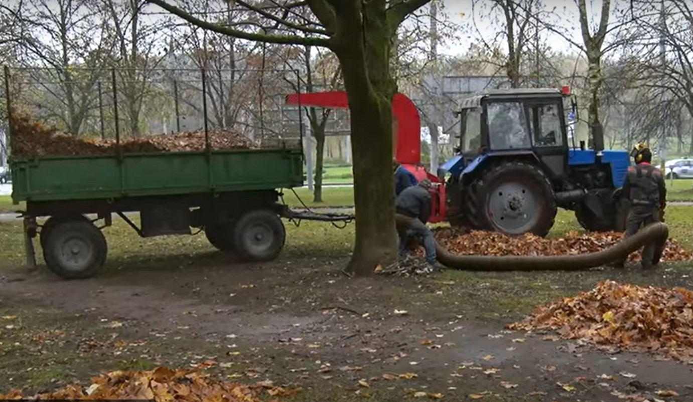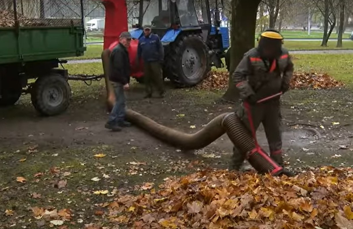 Новое для Гродно оборудование — листосос — переделали из дымососа, который обычно используют в лифтовом хозяйстве. Его «как раз собирались утилизировать». Под новую установку переоборудовали тракторный прицеп.