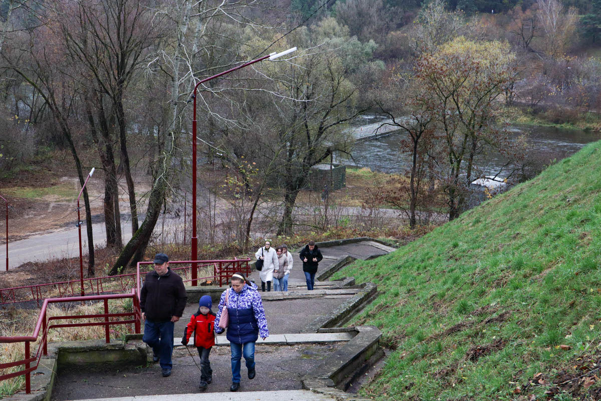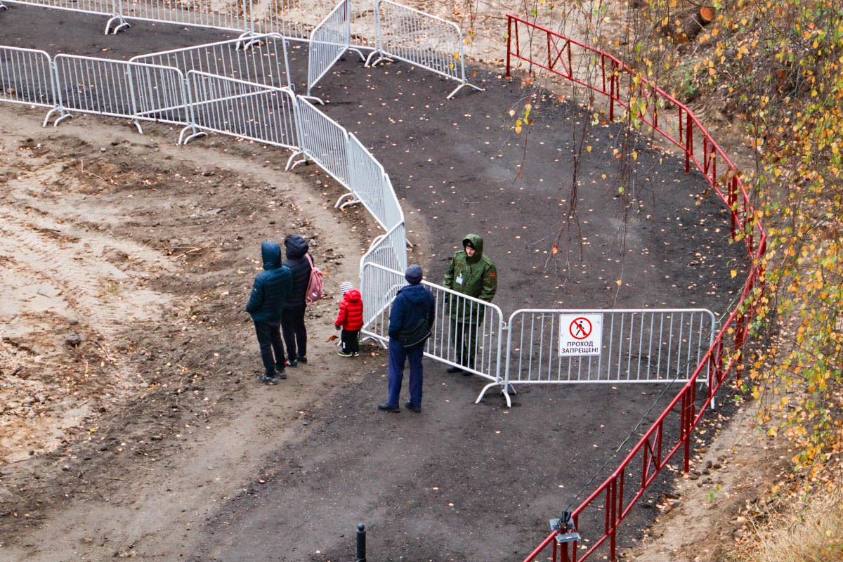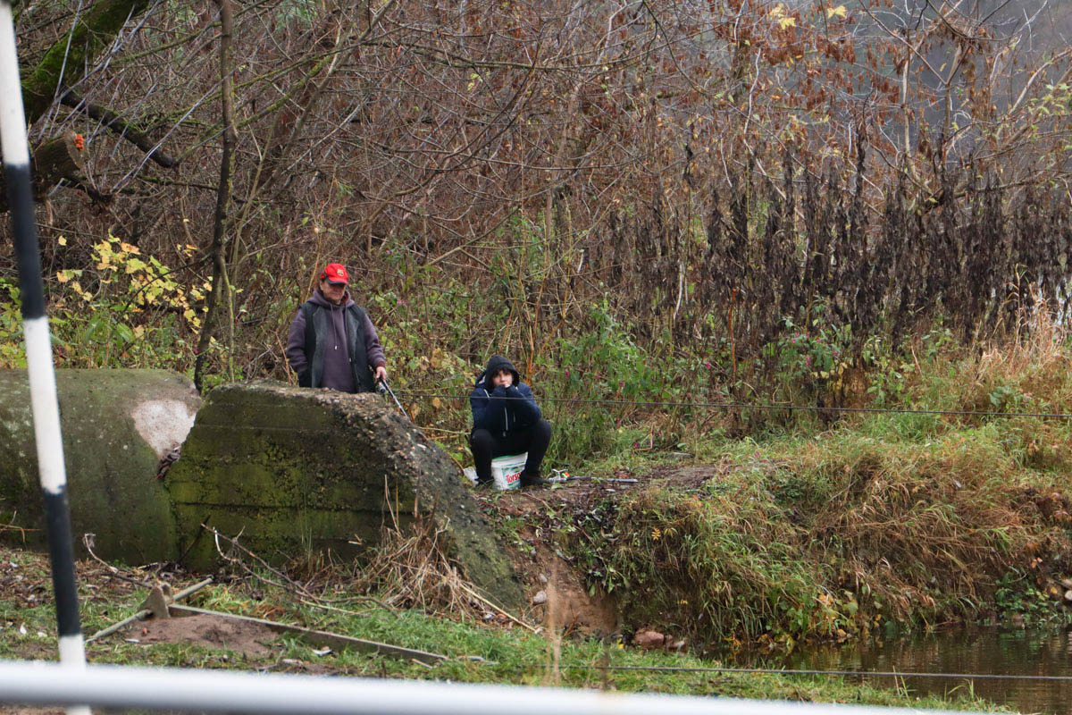 Время от времени с моста в реку падают камни — строительный мусор из технологических отверстий, которые сверлят в сооружениях. Проход под ту часть моста, где активно идут работы, закрыт. По другую сторону переправы у трубы очистных сооружений невозмутимо сидят рыбаки.