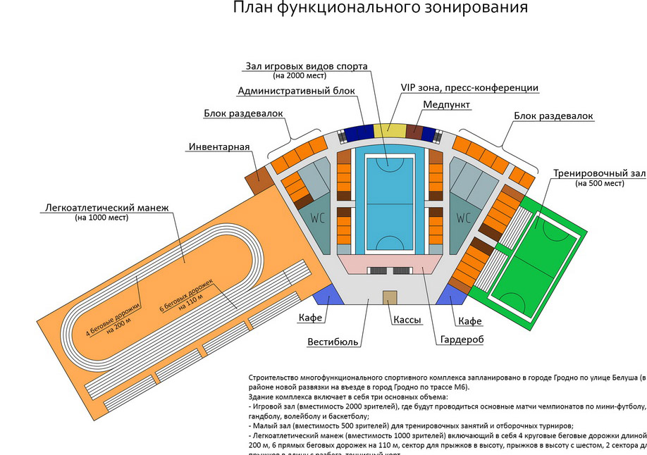 - игровой зал (вместимость 2000 зрителей), где будут проводиться основные матчи чемпионатов по мини-футболу, гандболу, волейболу и баскетболу международного уровня;