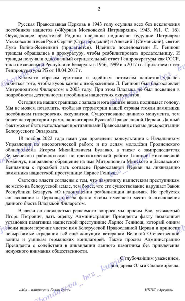 Поскольку было благославление, на снос нужно получить разрешение церкви. Осенью 2022 года Бондарева направила обращение на имя Митрополита Минского и Заславского Вениамина с просьбой дать согласие Православной церкви на ликвидацию памятника в Зельве, сообщила активистка главе Администрации президента Игорю Сергиенко. Она просит дать оценку установке и содействовать в ликвидации «без привлечения ненужного внимания общественности».