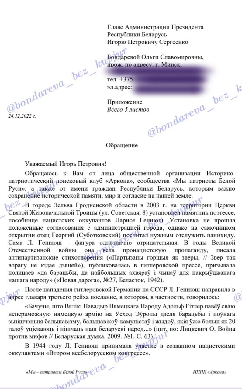 Памятник белорусской поэтессе Ларисе Гениюш на территории Церкви Святой Живоначальной Троицы в Зельве под угрозой сноса. Об этом Администрацию президента просит гродненская активистка Ольга Бондарева. Она предлагает ликвидировать памятник “без привлечения ненужного внимания общественности”.