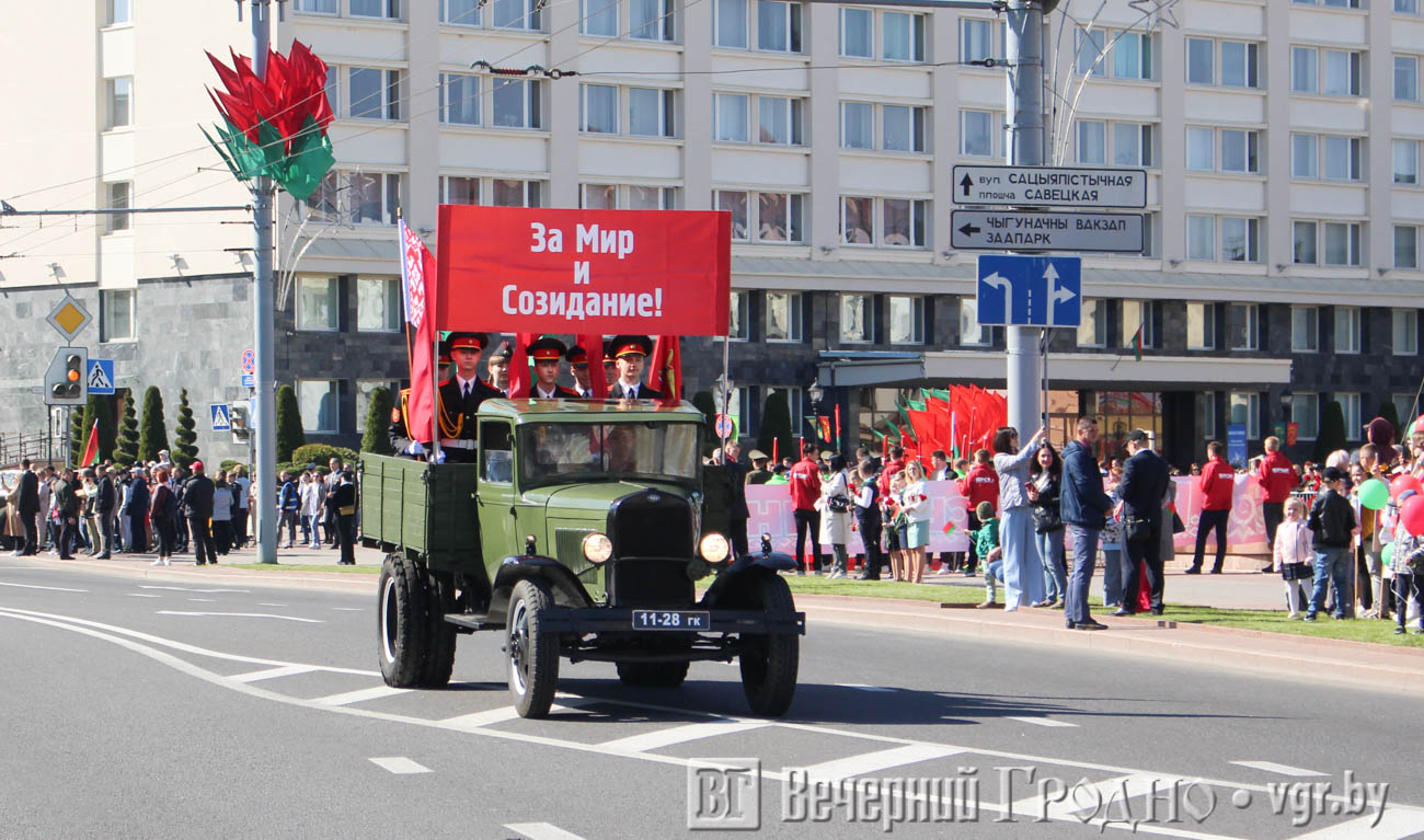 В начале автоколонны проехал автомобиль ГАЗ-АА. За ним ехали автомобили гродненских предприятий. “Гроднооблгаз” показал школьный выпускной 1941 года, Гродненский мясокомбинат — первый день войны. Автомобиль от “ГродноТоргСервиса” проехал с транспарантом “На Берлин!”. Гродненская табачная фабрика “Неман” показала военные будни.