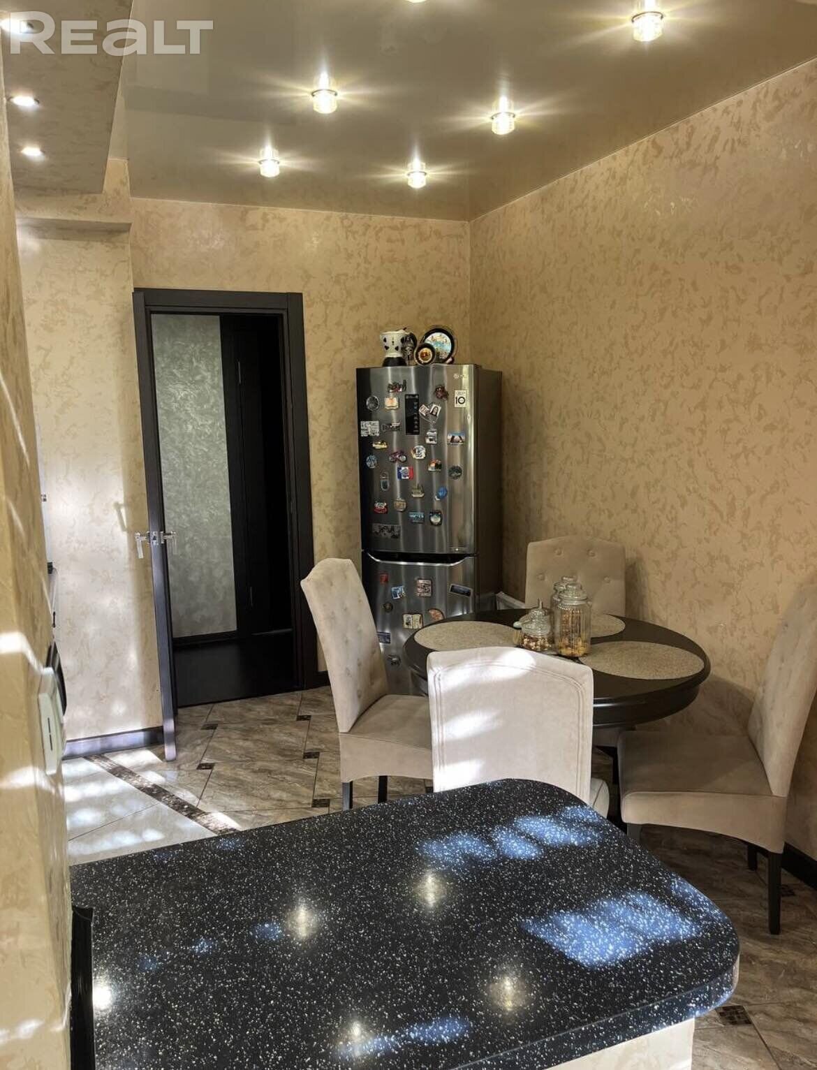 В квартире частичный ремонт. На первом этаже в жилых комнатах на полу плитка, ламинат. Стены выровнены, оклеены обоями. Потолки натяжные. На втором этаже простой ремонт. В интерьере преимущественно использовали черные, серые и желтые цвета. В гостиную с телевизором ведет арка.
